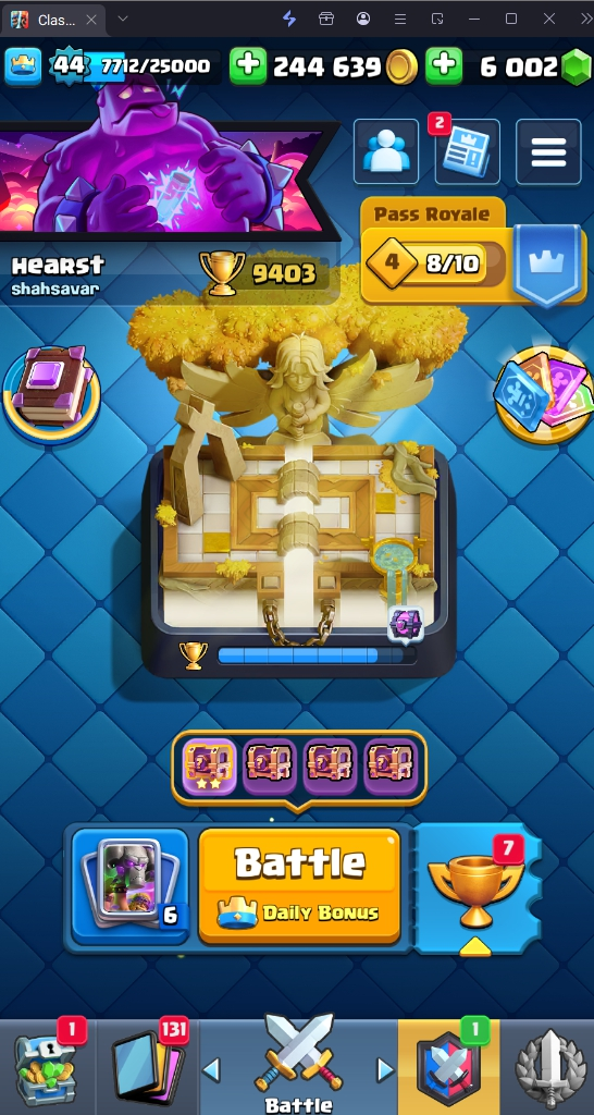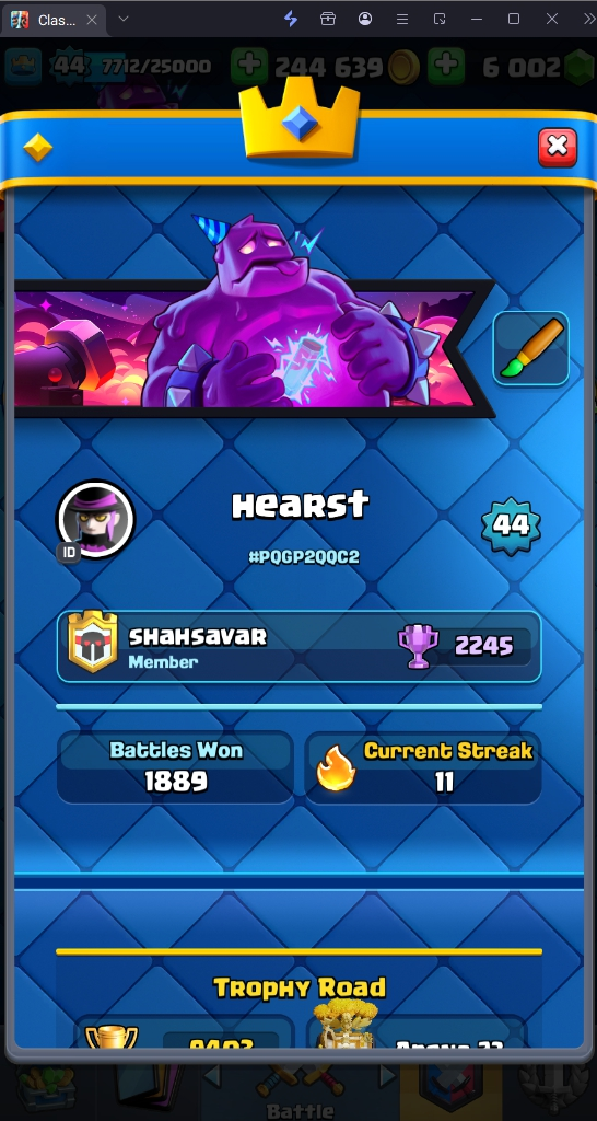 9403 TROPHIES 🏆 44 LVL 💯 KT 14 👑 121 CARDS ♦️ 9 MAX CARDS 👑 0 ELITE CARDS 🔮 10 EVO 💎 EMOTE 37 🎭 #PQGP2QQC2 ⸱ TAG ACCOUNT ⚙️ LEGENDARY ARENA • 9000 TROPHIES 💎