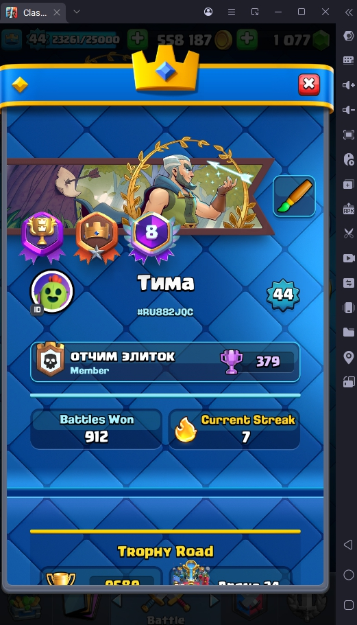 9589 TROPHY 🏆 44 LVL 💯 KT 14 👑 115 CARDS ♦️ 5 MAX CARDS 👑 2 ELITE CARDS 🔮 8 EVO 💯 EMOTE 29 🎭 #RU882JQC ⸱ TAG ACCOUNT ♥️