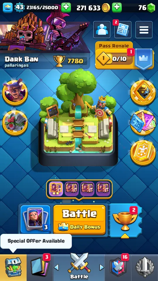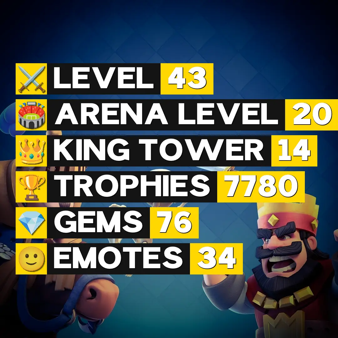 👑 King Tower 14 🏆 7780 Trophies ⚔️ Level 43 💎 Gems: 76 🧬 Evolutions: 10 🔒 Recovery Codes