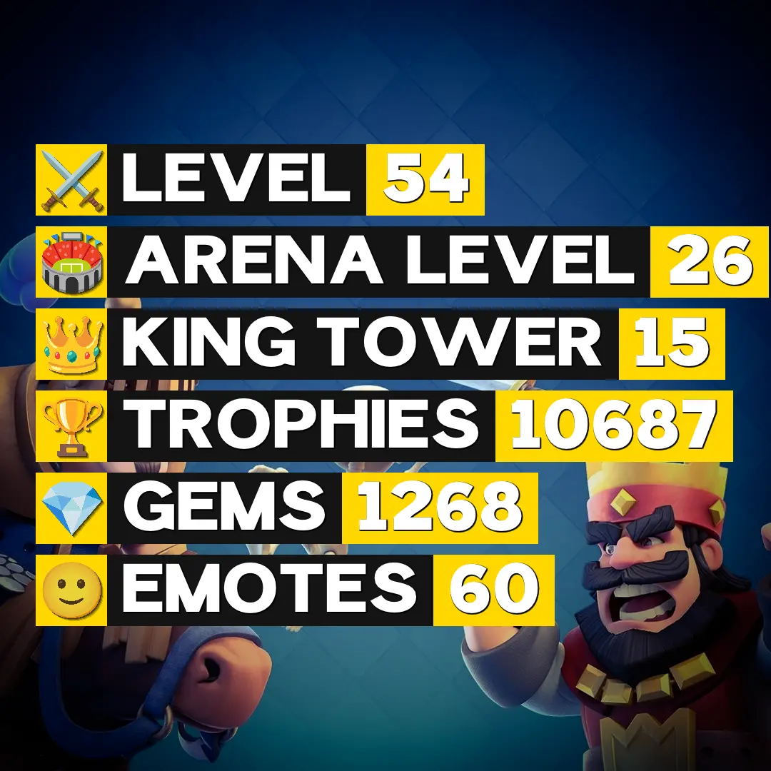 👑 King Tower 15 🏆 10687 Trophies ⚔️ Level 54 💎 Gems: 1268 🧬 Evolutions: 9 🔒 Recovery Codes