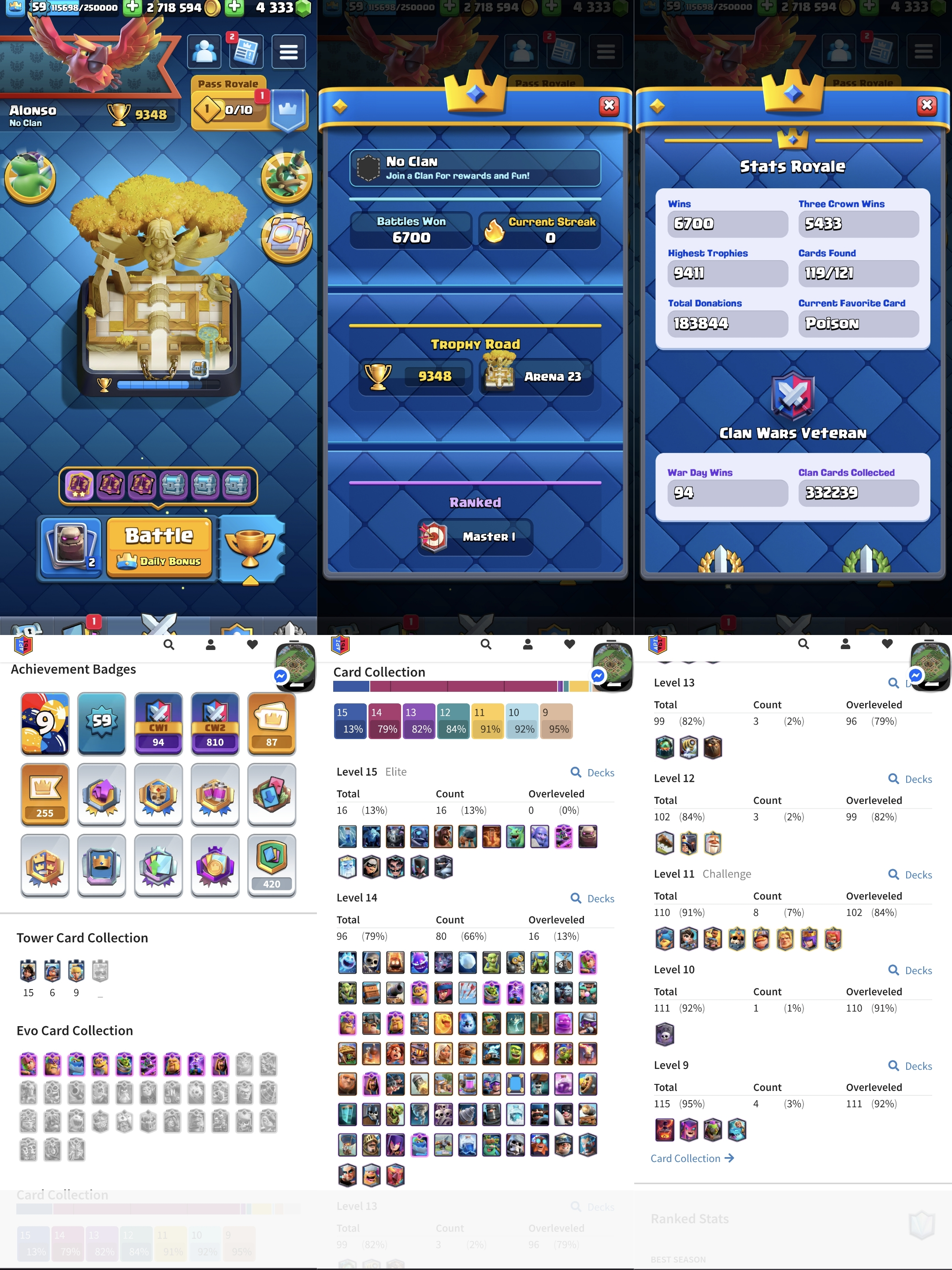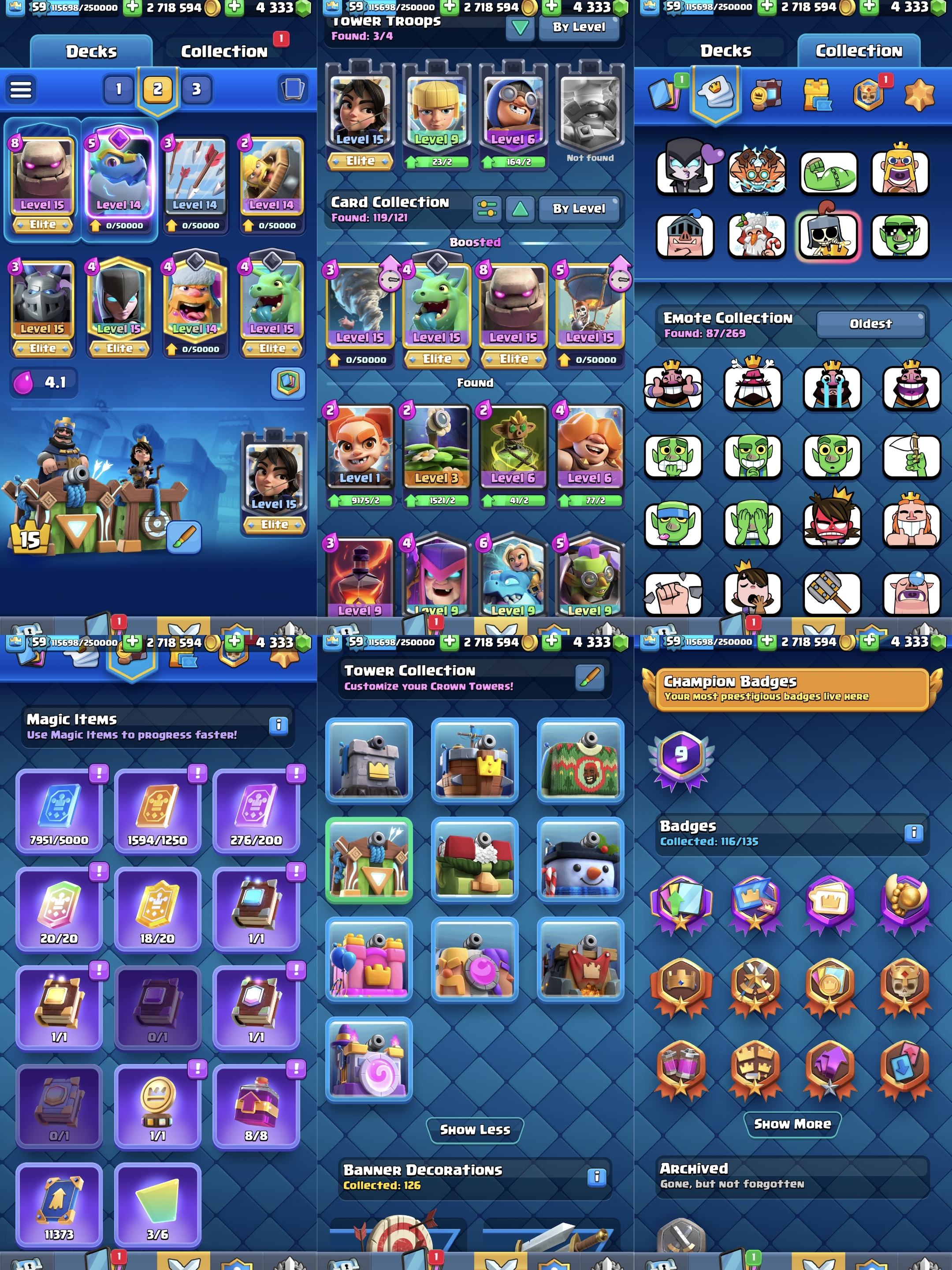 KT15 LVL59 | 119 CARD | 16 ELITE | 80 MAXED | ARENA 23 | 9 EVOLUTION | 9348 TROPHY | 87 RARE EMOTE| MAGIC ITEMS FULL | FULL ACCESS