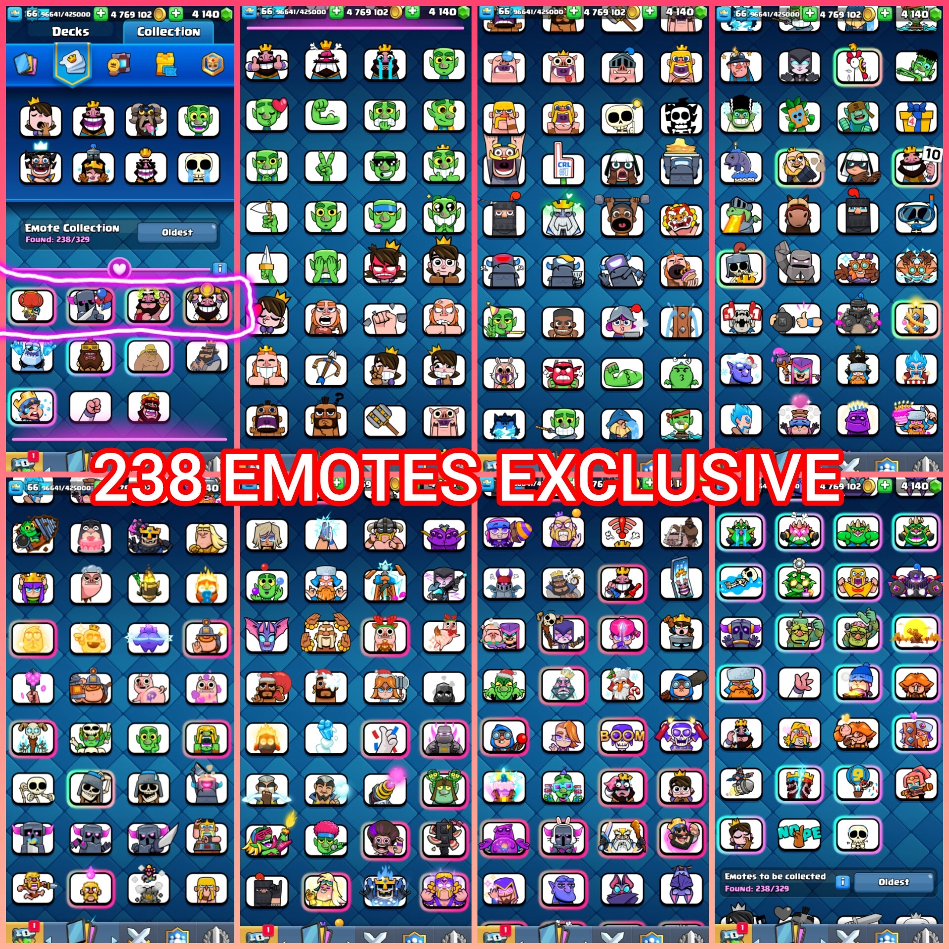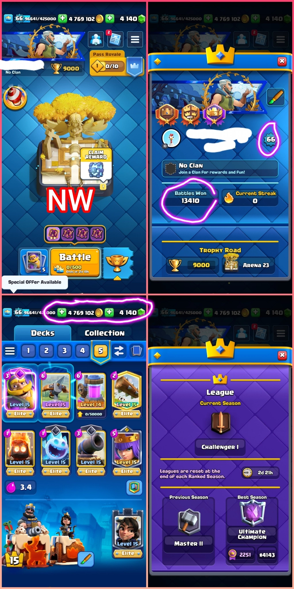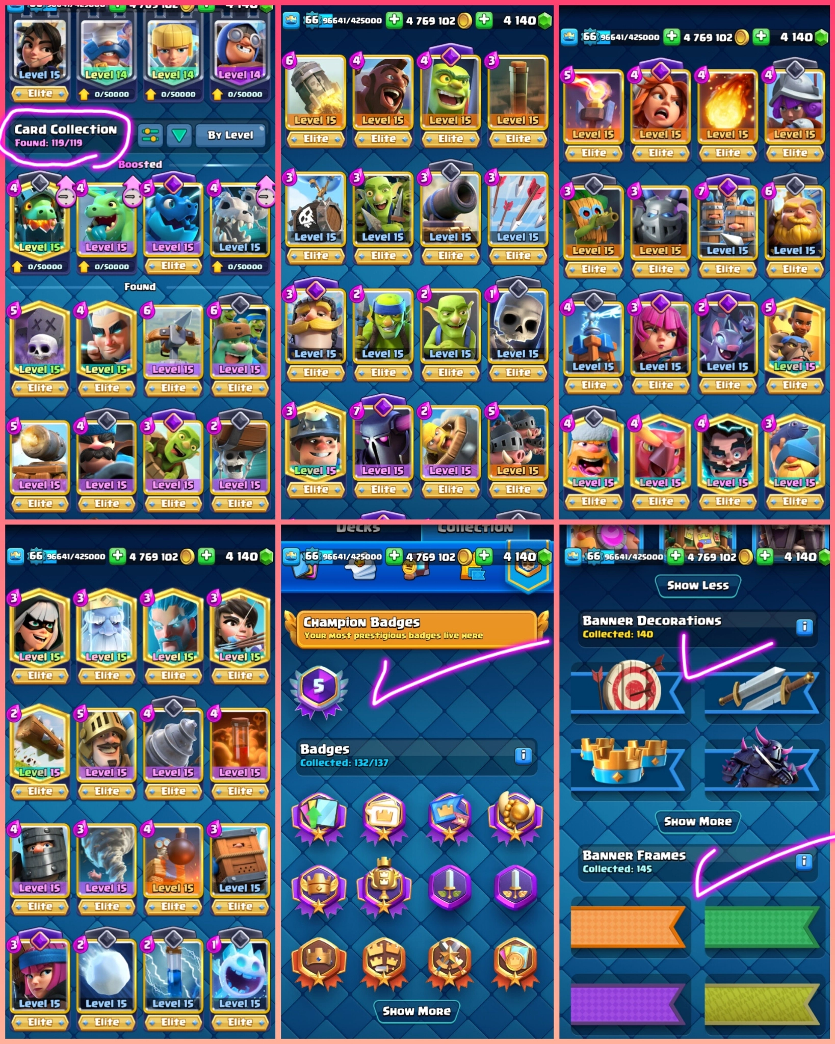 🎯50% 📴 US LOCAL 🇺🇸 TOP RANK 4143 TOP LADDER RANK 8917🏆119 MAX CARDS 61 ELITES 15 EVO 💯 XP 66 KT 15 ARENA 23👍🏻 CUPS 9K🏆17 TOWER SKINS 👍🏻 119 CARDS 238 EMOTES EXCLUSIVE