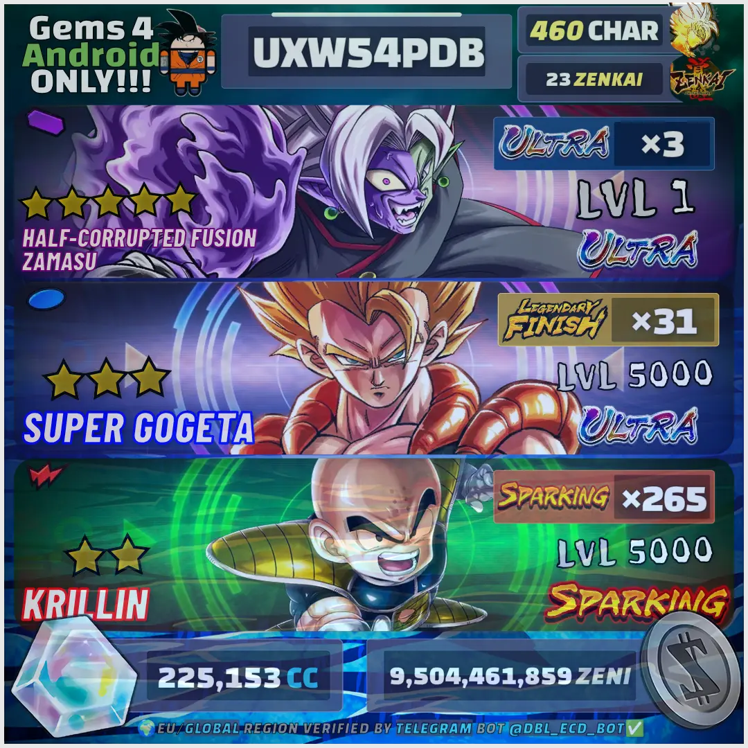 đ WHALE Legends Collection: [đ± Platform: Android, đ€ Characters: 460, đ Ultra: 3, âïž Sparking: 265, đ Crystals: 225153, đ Limited: 31, ⥠Zenkai: 23] âž± PREMIUM COLLECTION | GUARANTEED SAFE !AGG02247