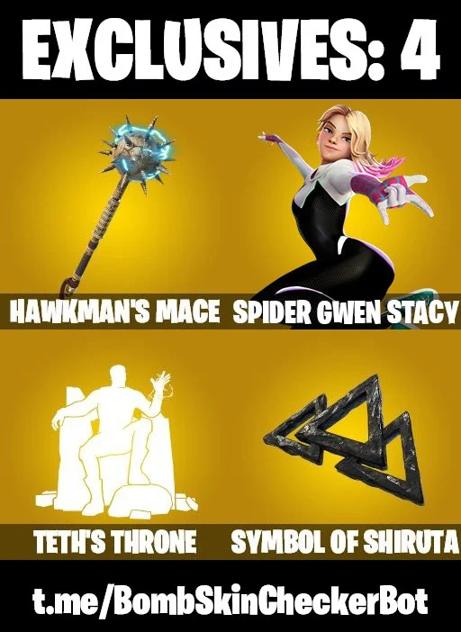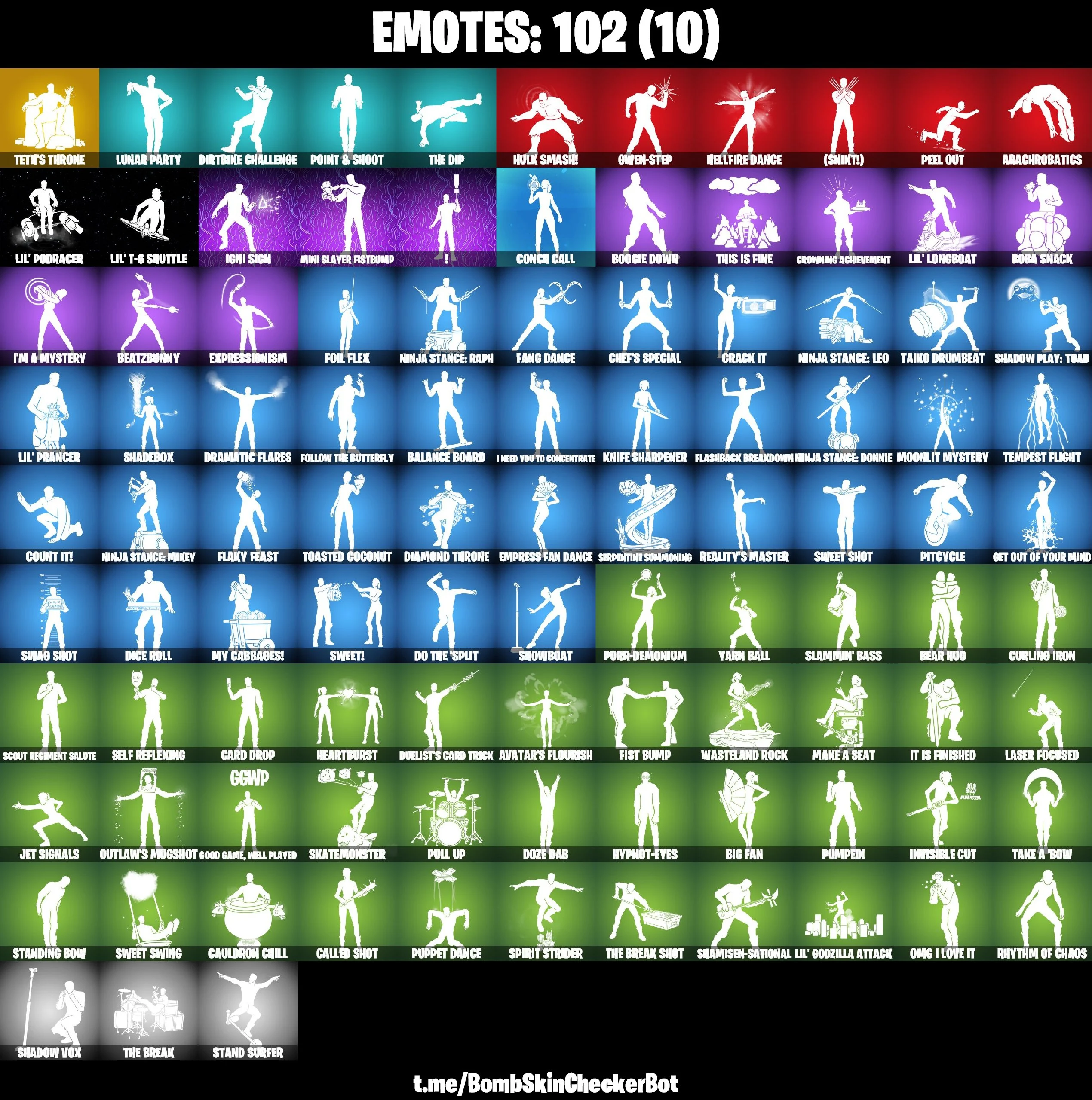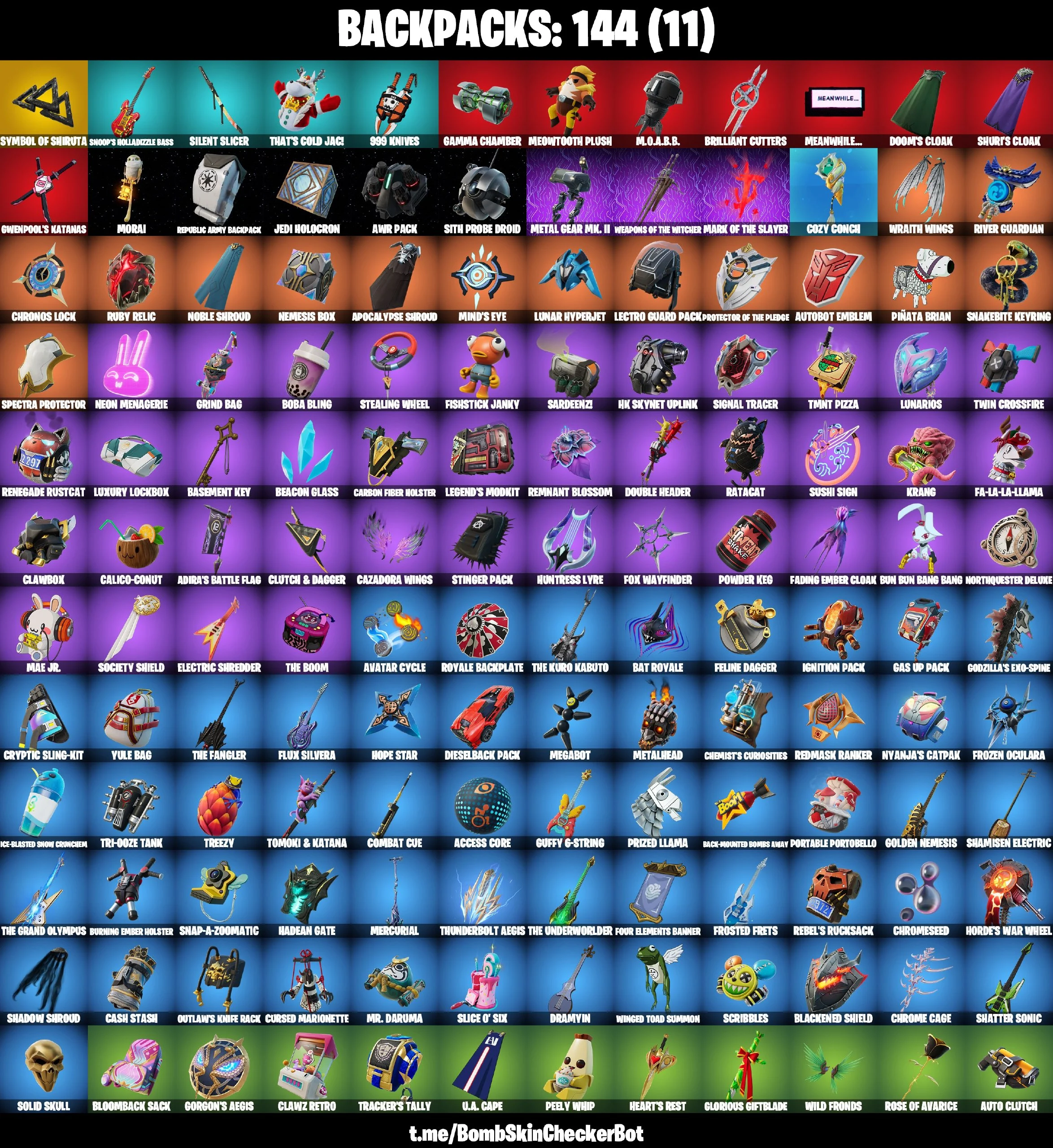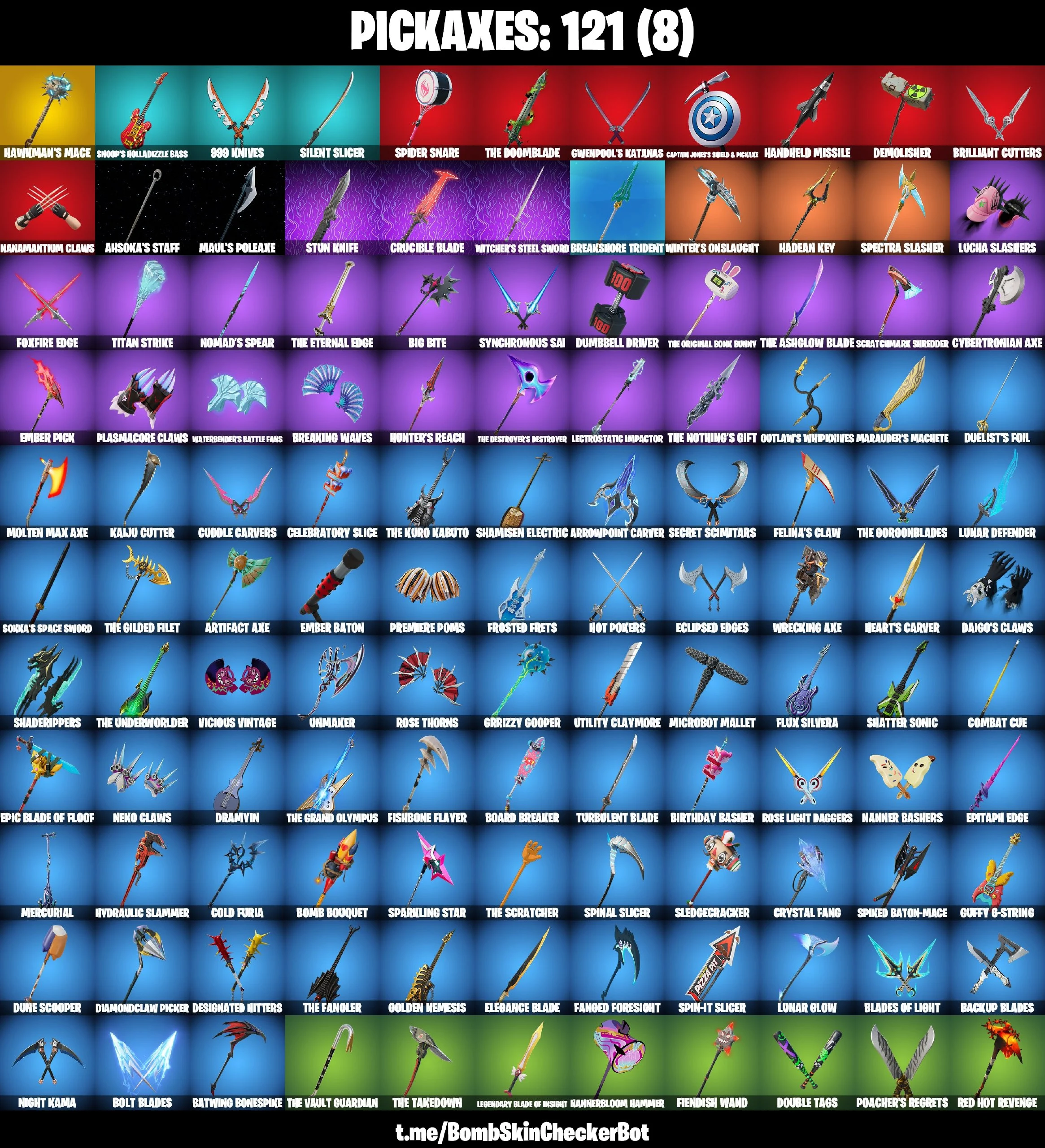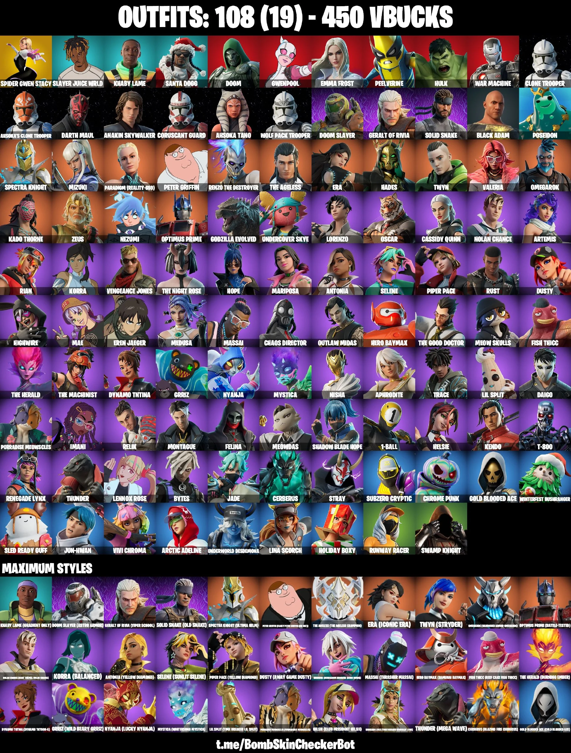 🔮108 Skins🔮 Spidergwen (Stacy)💎Meow Skulls💎Eren Jaeger💎Khaby Lame💎Ashoka Tano💎Anakin Skywalker💎Darth Maul💎Doom Slayer💎Geralt Of Rivia💎Solid Snake💎Slayer Juice Wrld