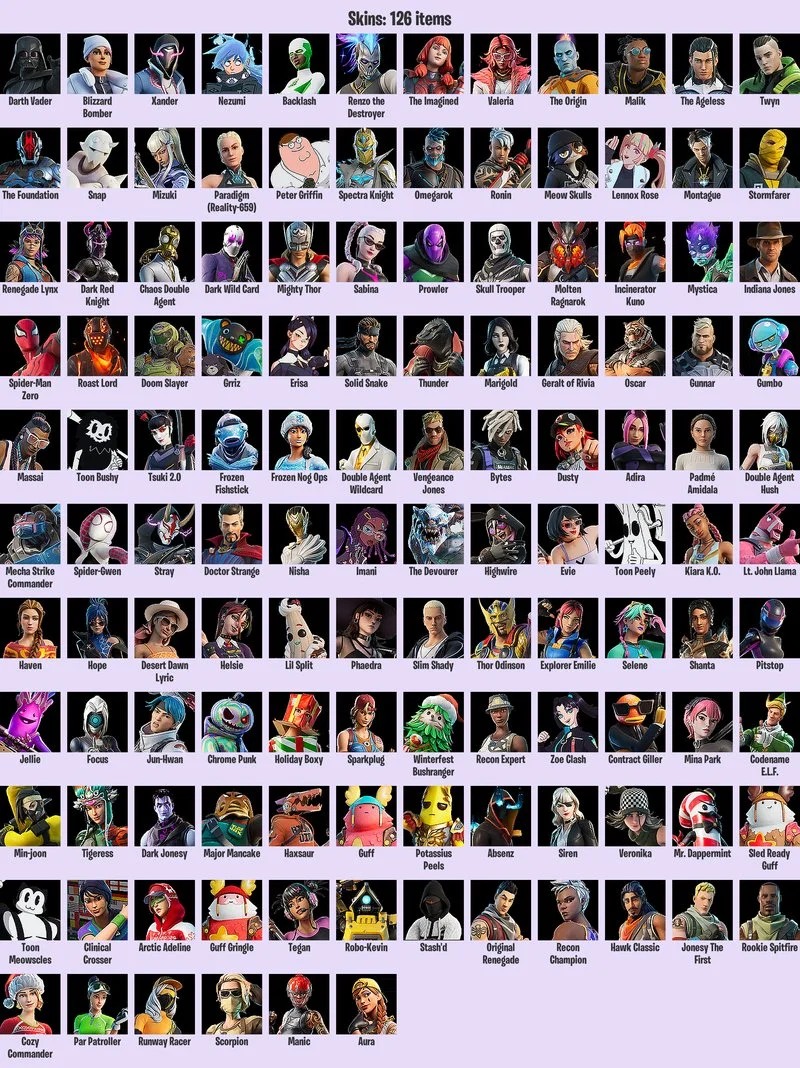 126 Skins|Darth Vader|Blizzard Bomber|Xander|Nezumi|Backlash|Renzo the Destroyer|The Imagined|Valeria|The Origin|Malik|The Ageless|Twyn