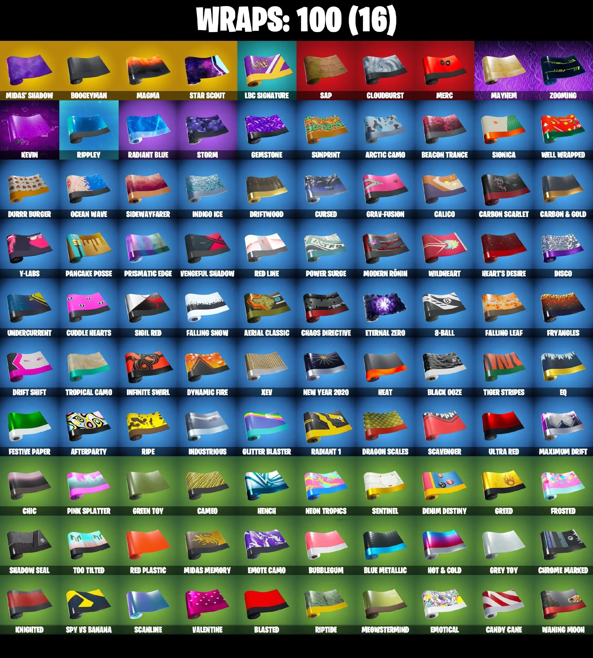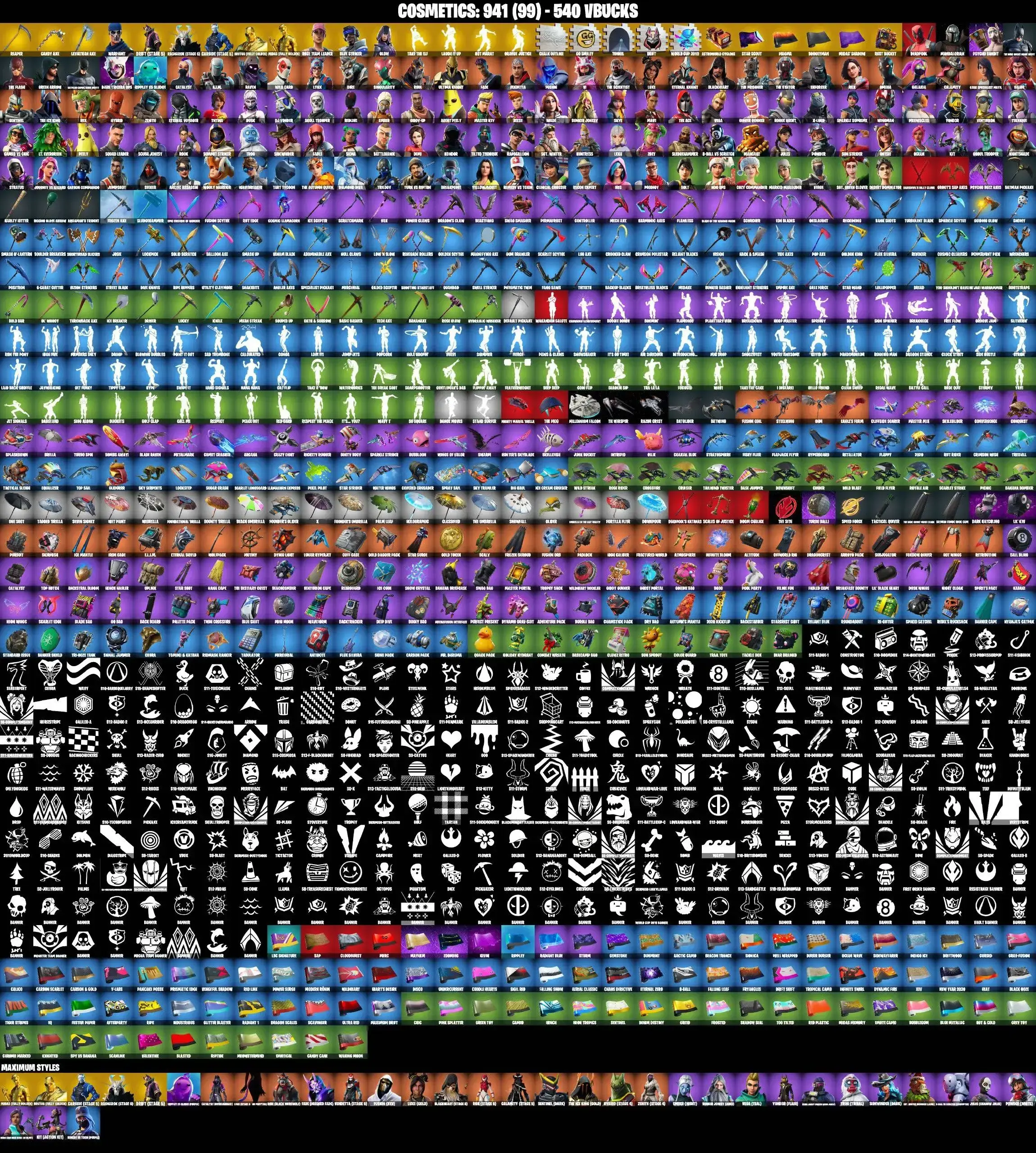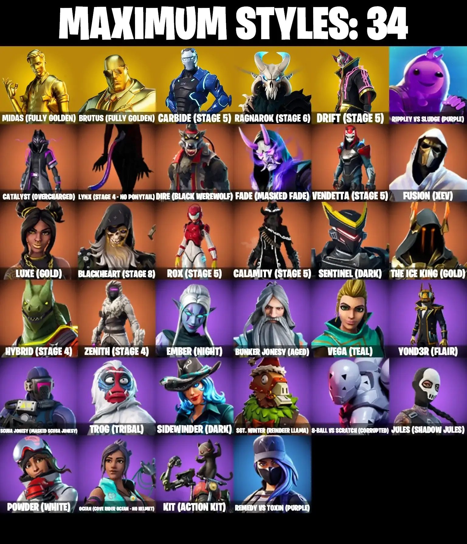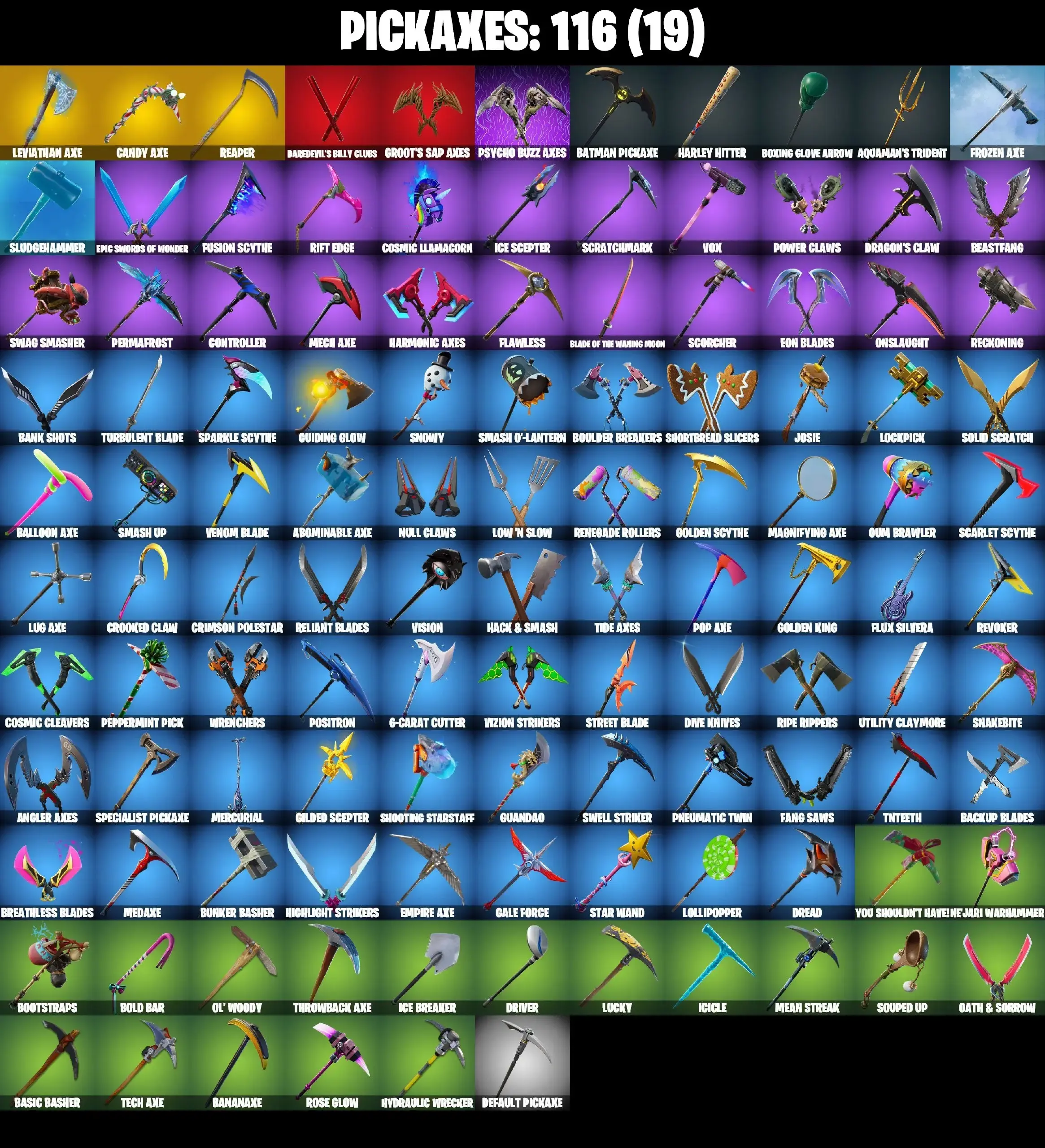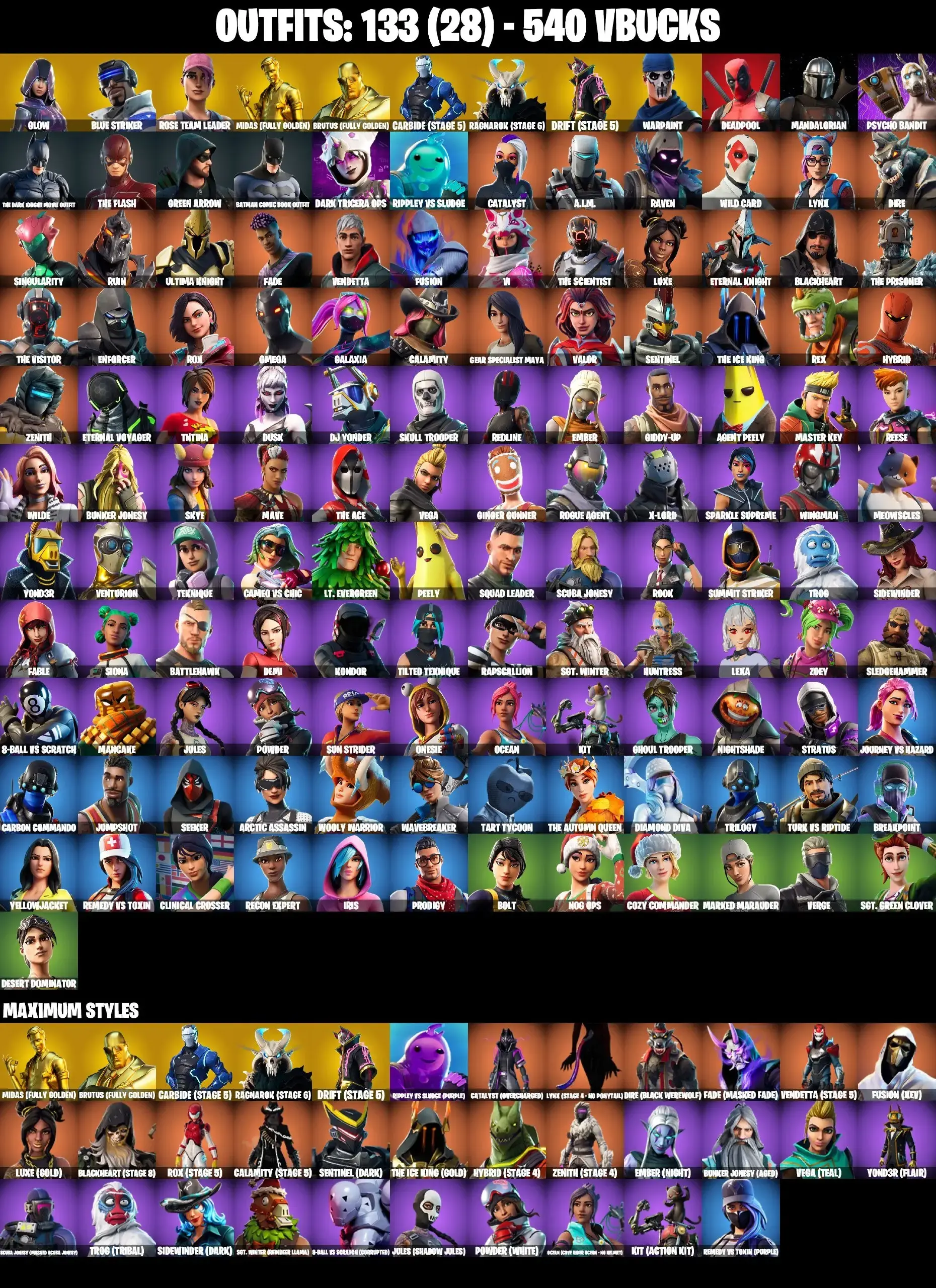 133 SKINS | LEVIATHAN AXE | GLOW | PSYCHO BANDIT | OG STW FOUNDERS | SKULL TROOPER | GHOUL TROOPER | OMEGA | MANDALORIAN | THE FLASH | CATALYST MAX | GOLDEN MIDAS | CANDY AXE | STAR WAND | ORANGE JUSTICE | LAUGH IT UP | GALAXIA |