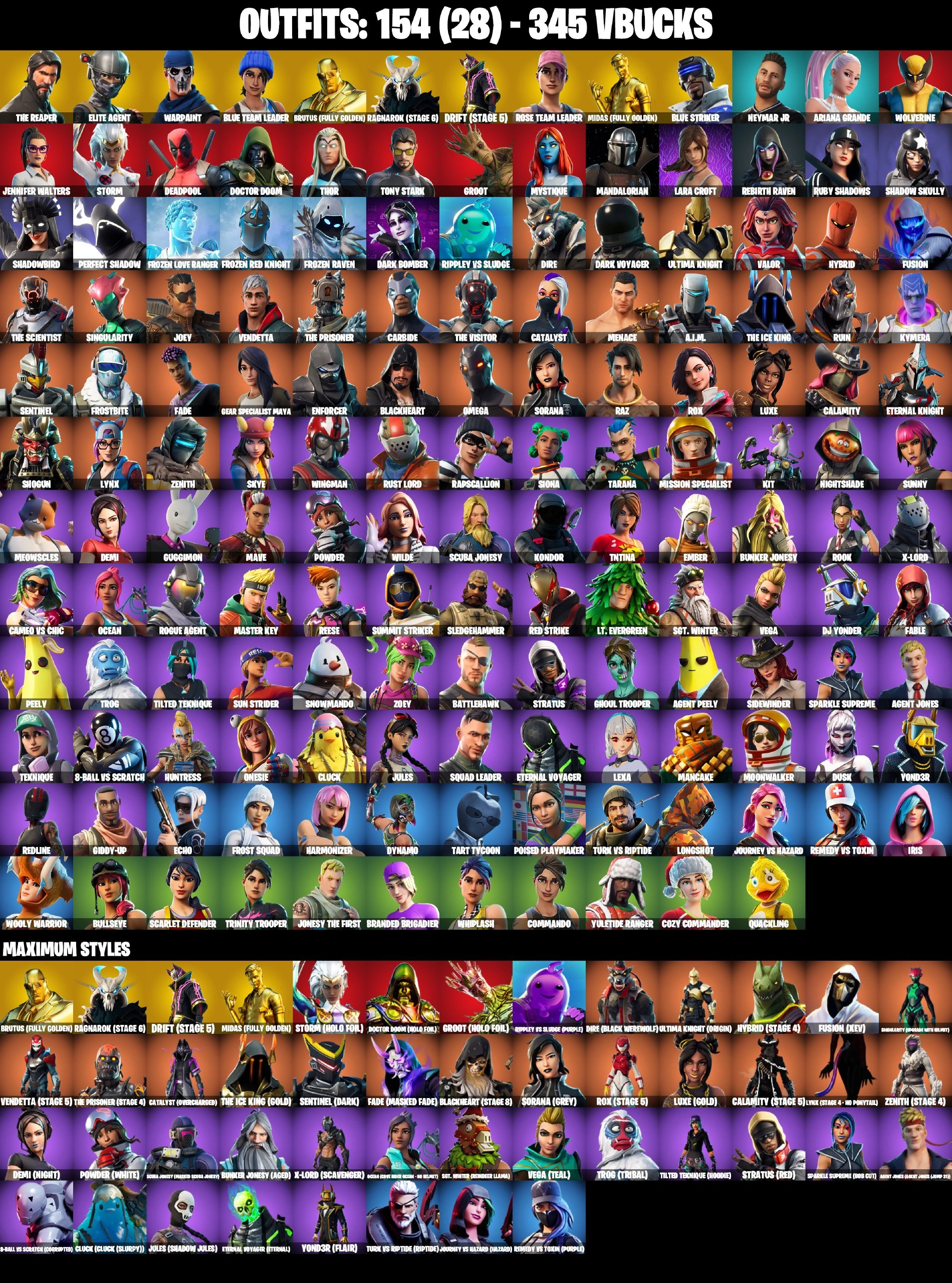 154 SKINS ⸱ THE REAPER ⸱ TAKE THE L ⸱ LAUGH IT UP ⸱ CANDY AXE ⸱ VISION ⸱ OG STW ⸱ ARIANA GRANDE ⸱ OMEGA ⸱ DIRE ⸱ LARA CROFT ⸱ GHOUL TROOPER ⸱ EVERGREEN ⸱ FADE ⸱ MAYA ⸱ SORANA ⸱ MENACE ⸱ CATALYST ⸱ CARBIDE ⸱ MANADALORIAN ⸱ REBIRTH