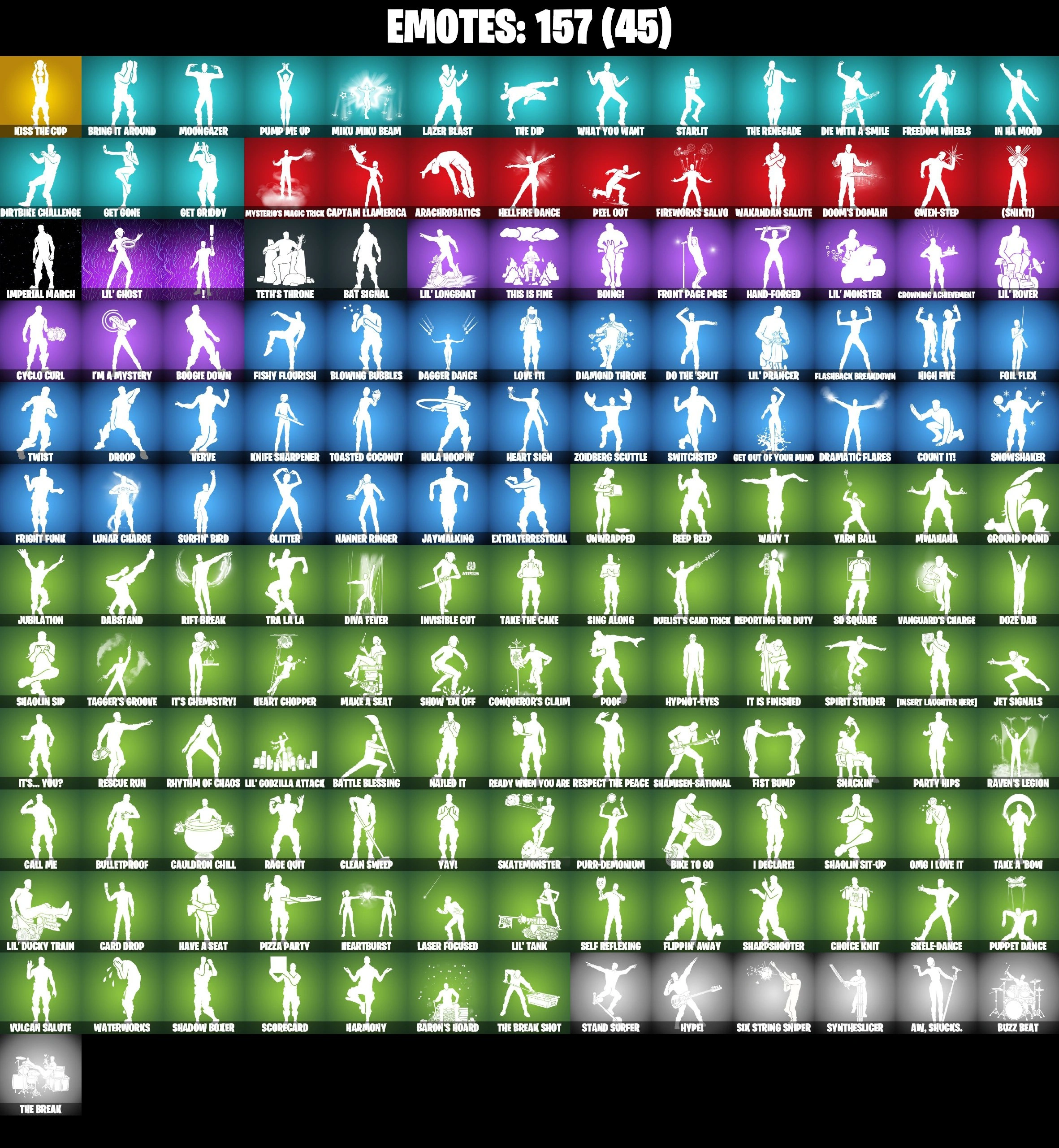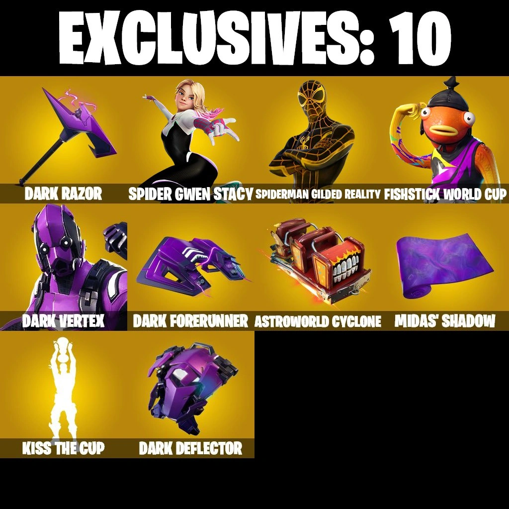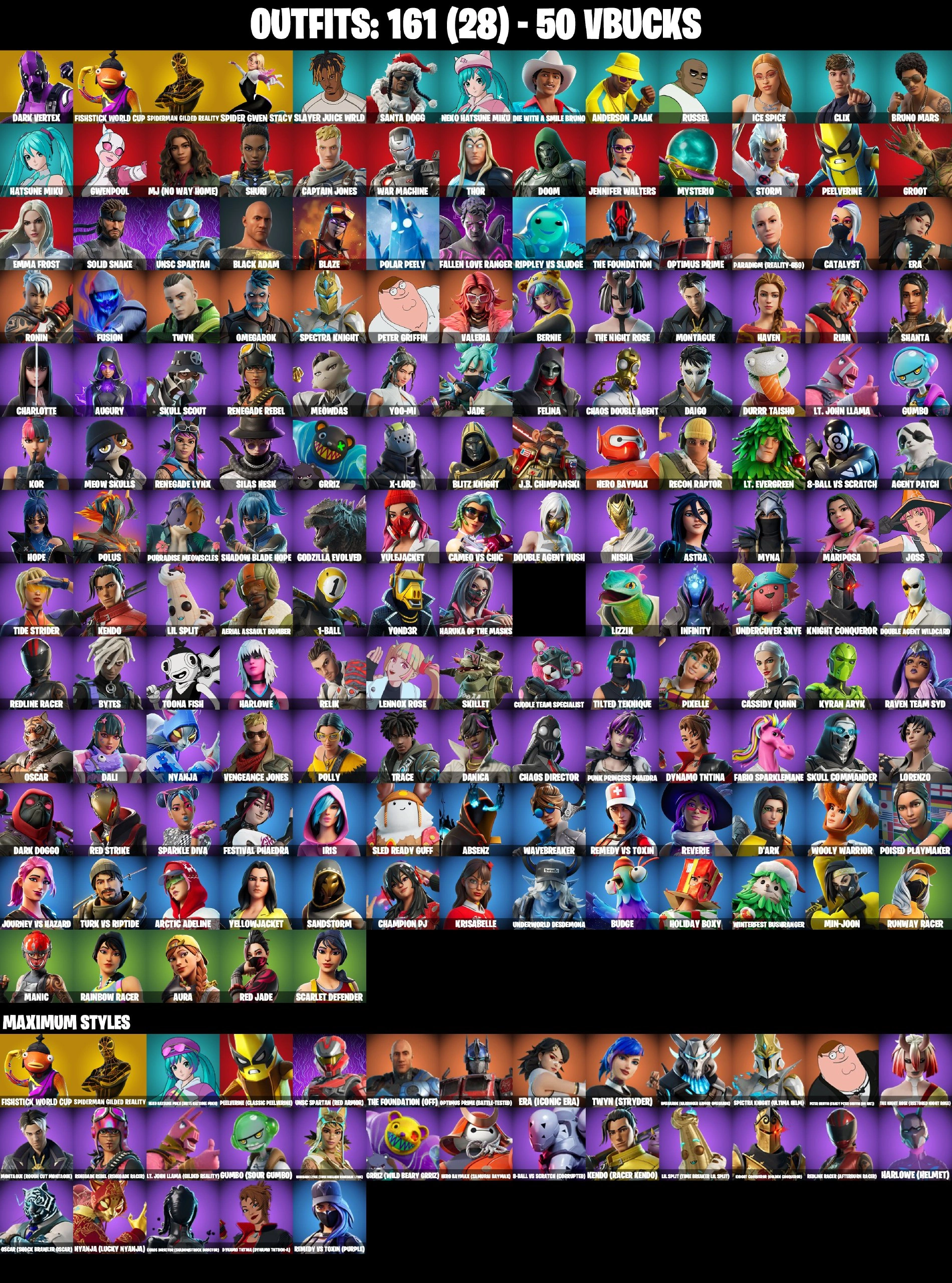 161 SKINS | DARK VERTEX | FISHSTICK WORLD CUP | GILDED SPIDER-MAN | SPIDER-GWEN STACY | STAR WAND | NEKO HATSUNE MIKU MAX | ERA MAX | CHAOS DIRECTOR MAX | CHARLOTTE | KOR | SKULL SCOUT | SKULL SCOUT | MARIPOSA | REVERIE | FESTIVAL