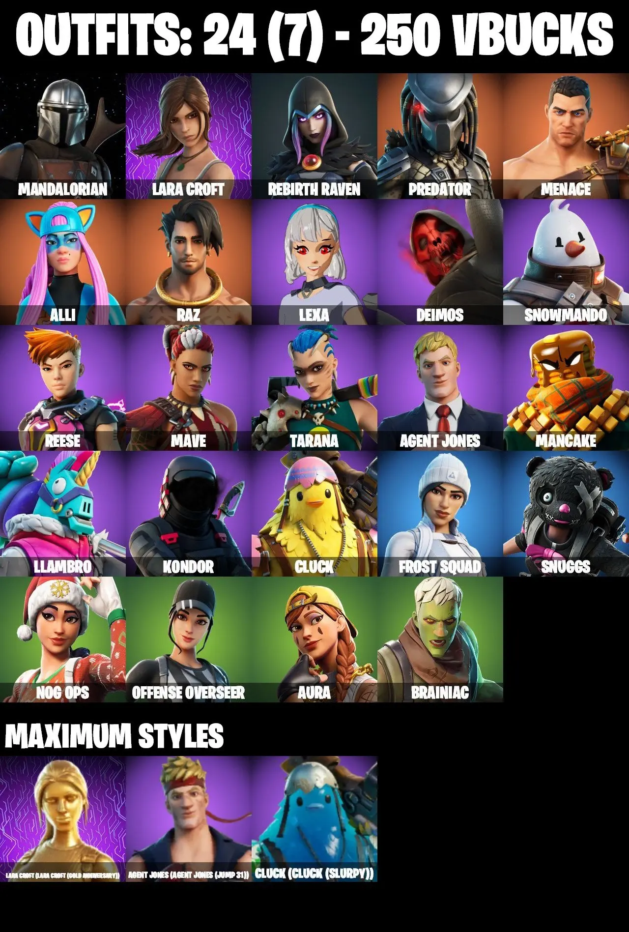 24 SKINS | GOLDEN LARA CROFT | LARA CROFT | BRAINIAC | PREDATOR | AURA | NOG OPS | OFFENSE OVERSEER | CAN PLAY ON PSN,XBOX,PC,NINTENDO,MOBILE | 250 VBUCKS | FULL EMAIL ACCESS