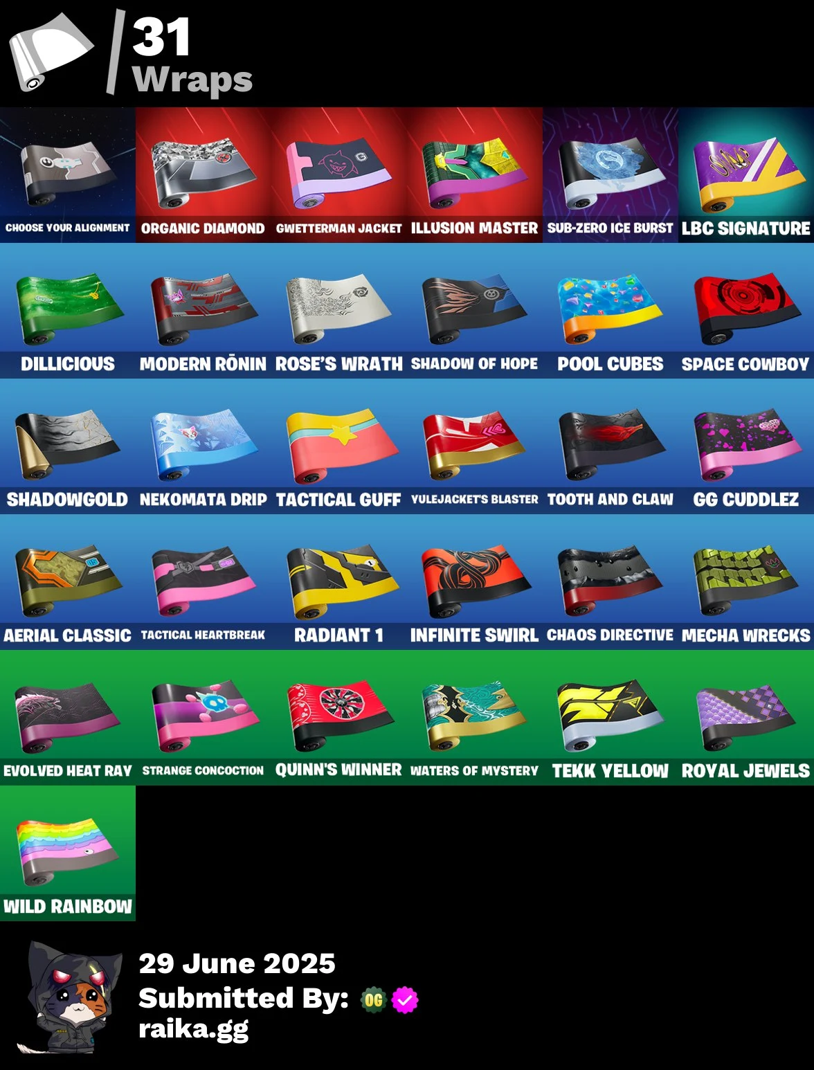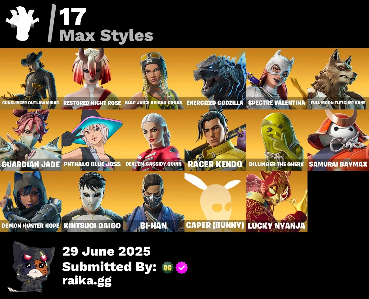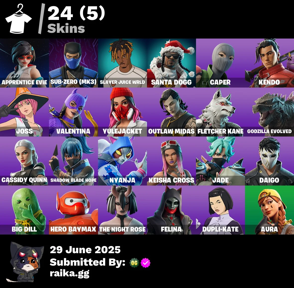 24 skins | Apprentice Evie | Sub-Zero (MK3) | Slayer Juice WRLD | Santa Dogg | Caper | Kendo | Joss | Valentina | Yulejacket | Outlaw Midas | 400 VB | Nai@1