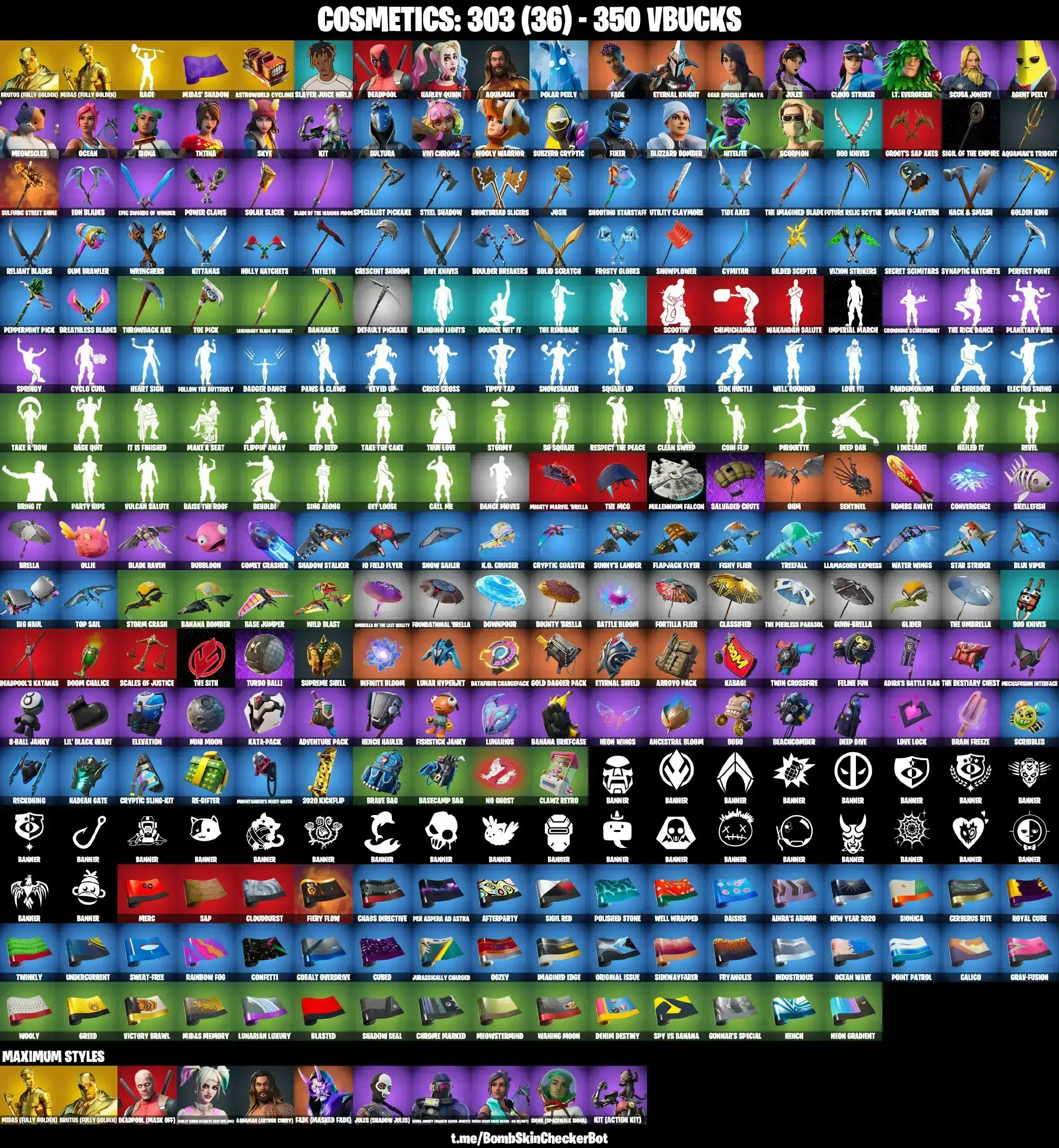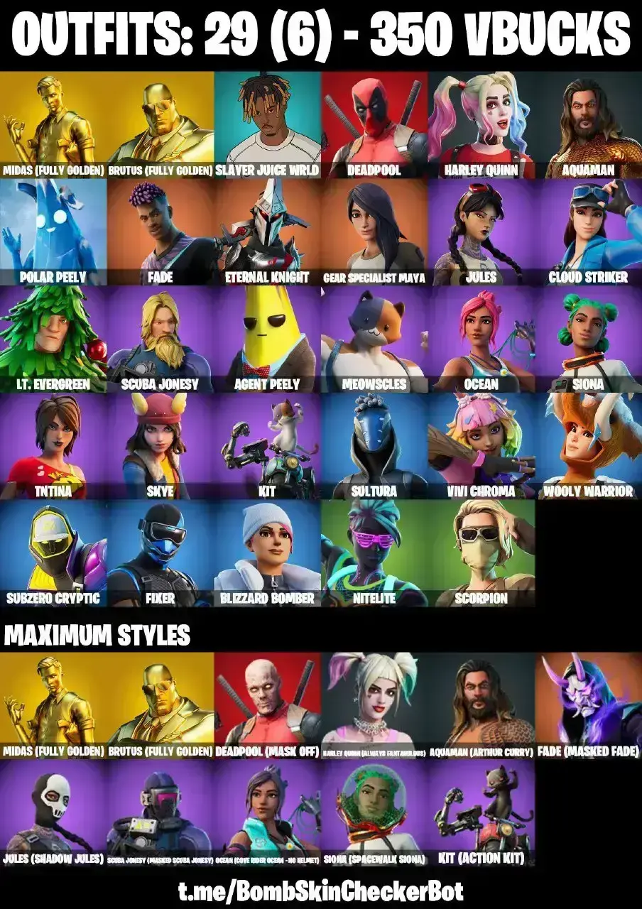 29 SKINS | GOLDEN MIDAS | HARLEY QUINN MAX | MAYA | JULES MAX | AGENT PEELY | SKYE | NTELITE | SCORPION | SLAYER JUICE WRLD | ASTROWORLD CYCLONE | PEPPERMINT PICK | CAN PLAY ON PSN,XBOX,PC,NINTENDO,MOBILE | 350 VBUCKS | FULL EMAIL