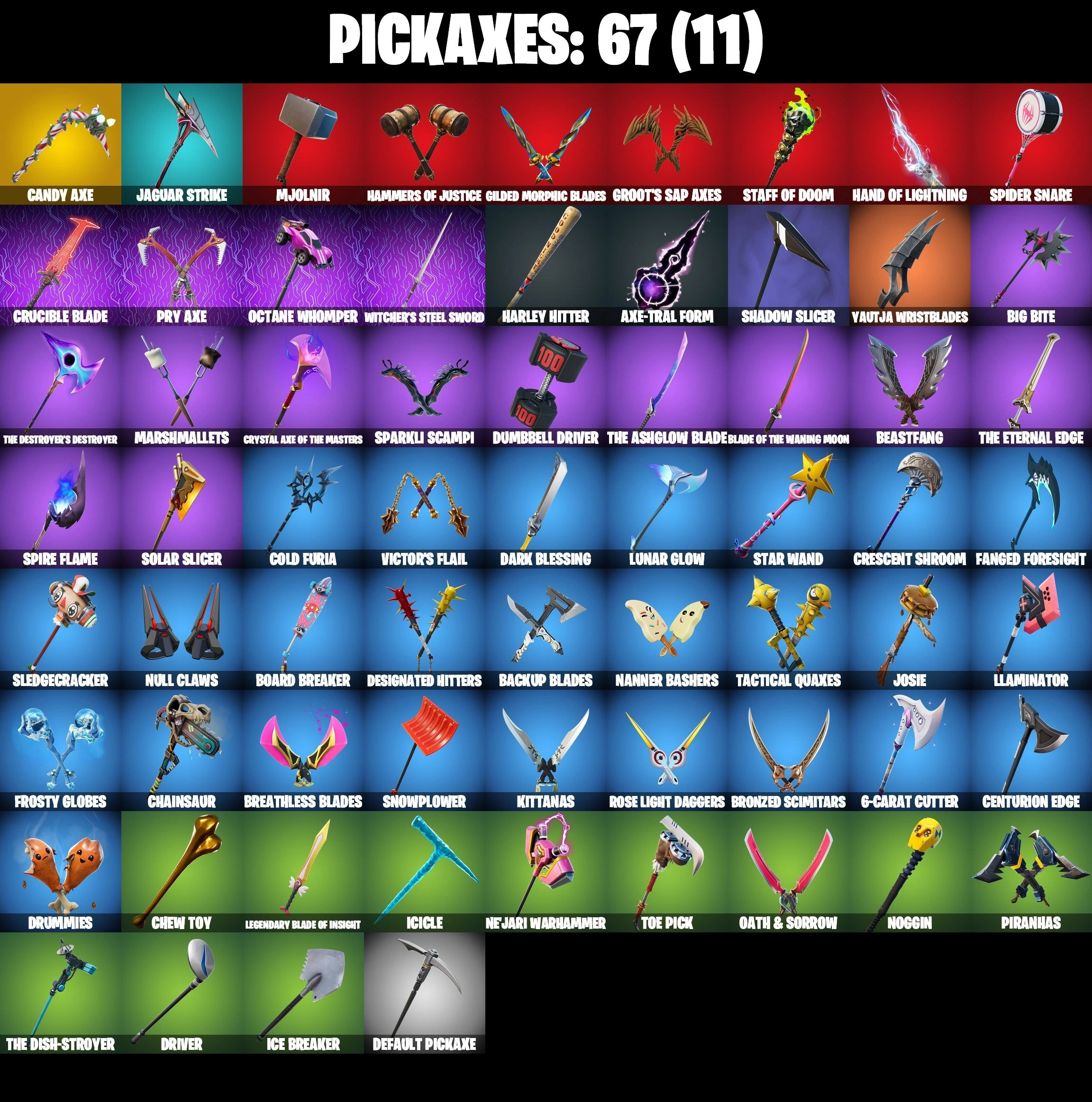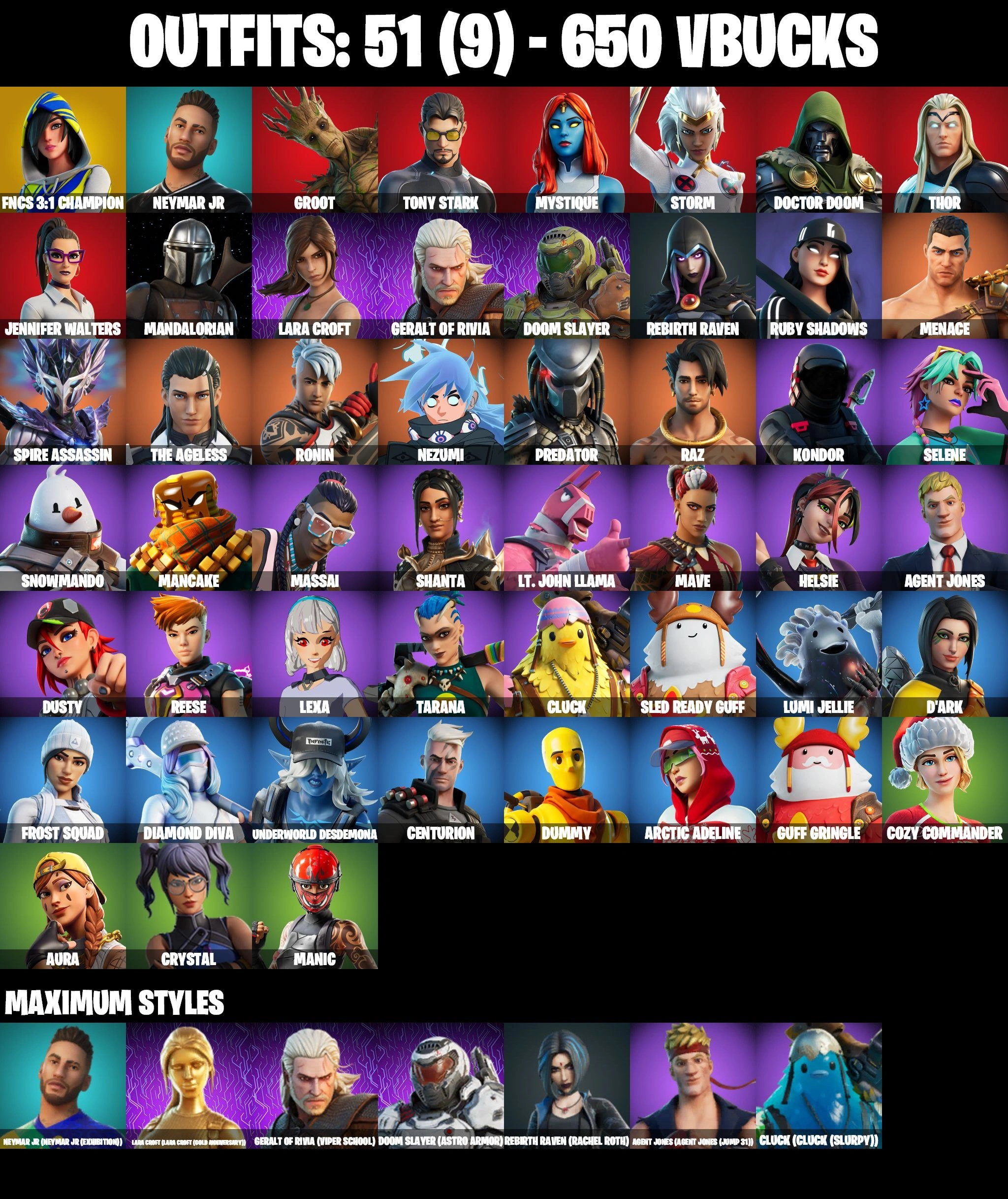 51 SKINS ⸱ CANDY AXE ⸱ FNCS 3:1 CHAMPION ⸱ GOLDEN LARA CROFT ⸱ REBIRTH RAVEN RACHEL ROTH ⸱ DUMMY ⸱ DUSTY ⸱ HELSIE ⸱ MENACE ⸱ LEXA ⸱ DUMMY ⸱ STAR WAND ⸱ ICE BREAKER ⸱ WATERWORKS ⸱ LUMI JELLIE ⸱ AGENT JONES ⸱ MANDALORIAN