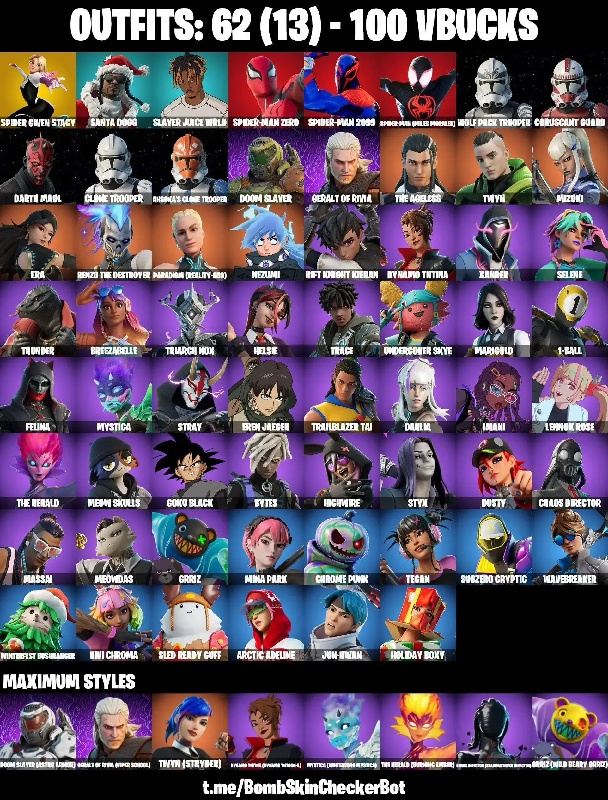 62 SKINS | MINA PARK | SPIDER-MAN ZERO | SPIDER-MAN 2099 | SPIDER-MAN MILES MORALES | SPIDER-GWEN STACY | WOLF PACK TROOPER | CORUSCANT GUARD | DARTH MAUL | CLONE TROOPER | AHSOKAS CLONE TROOPER | EREN JAEGER | GOKU BLACK | MYSTIC