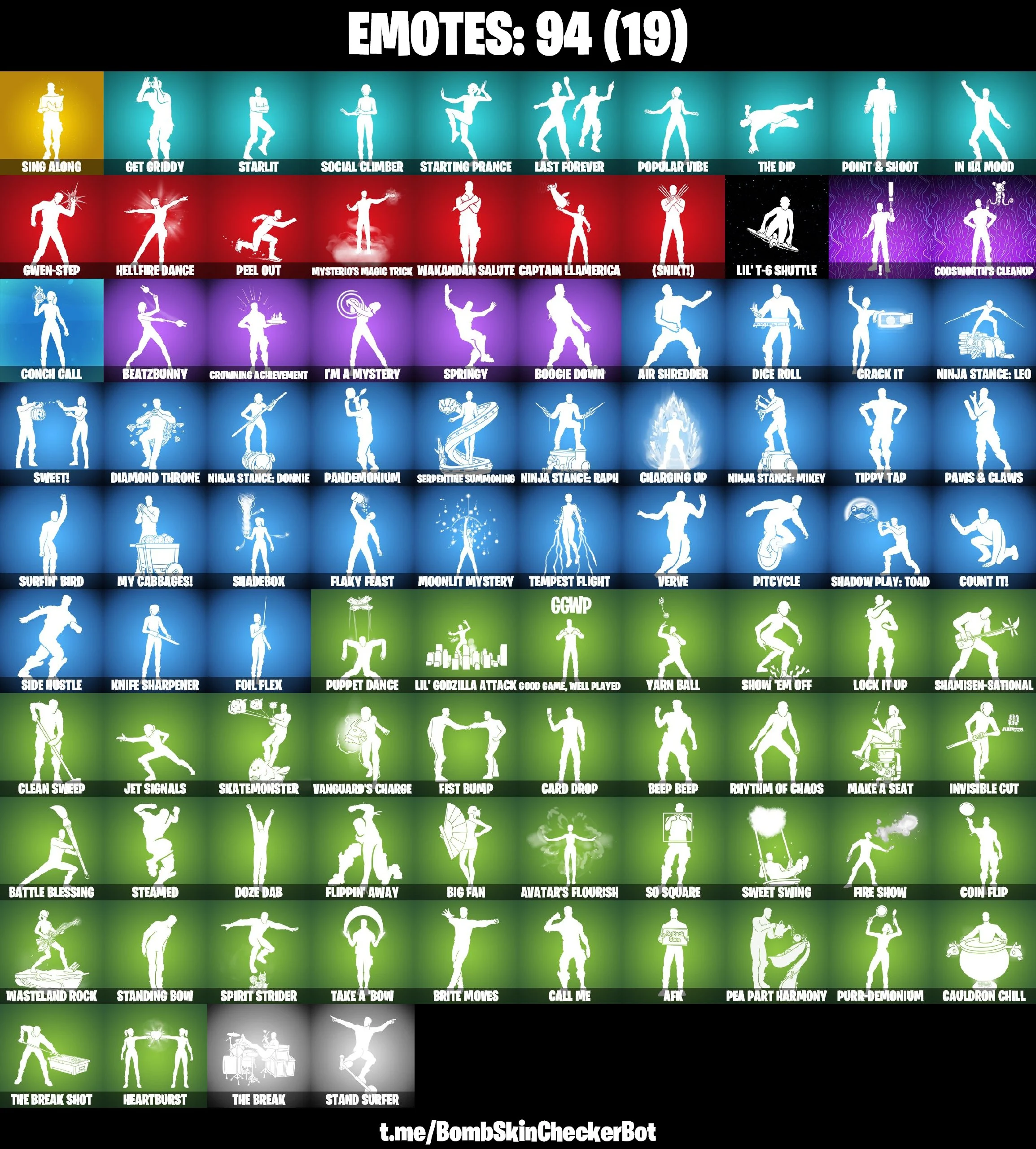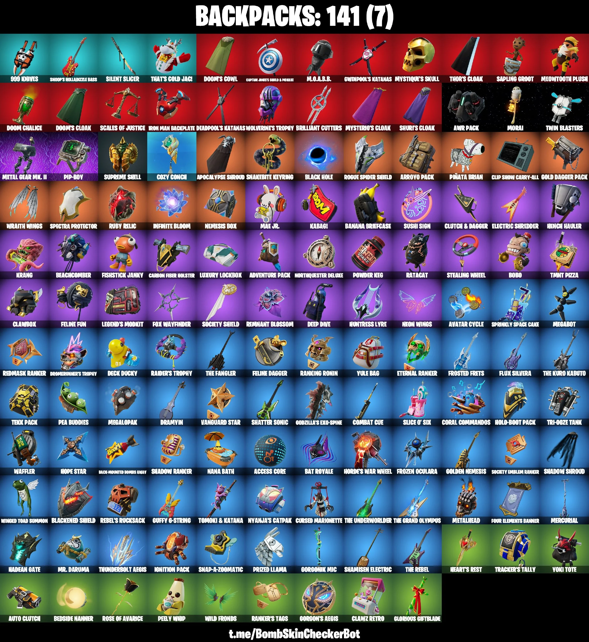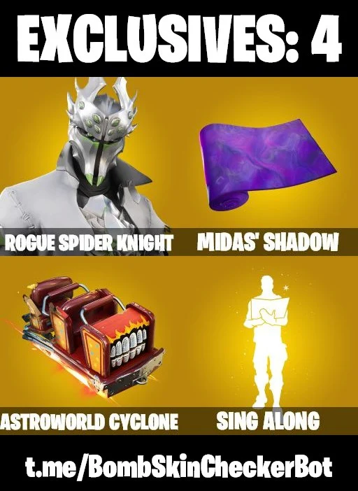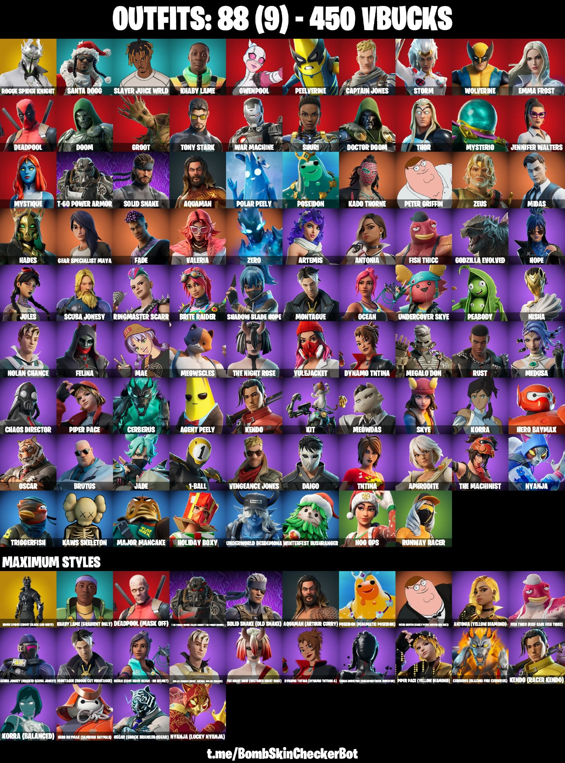 🔮88 Skins🔮 Rogue Spider Knight💎Tony Stark💎Jules💎Polar Peely💎Khaby Lame💎Jennifer Walters💎Solid Snake💎Ocean💎Slayer Juice Wrld💎Holiday Boxy💎Winterfest Bushranger