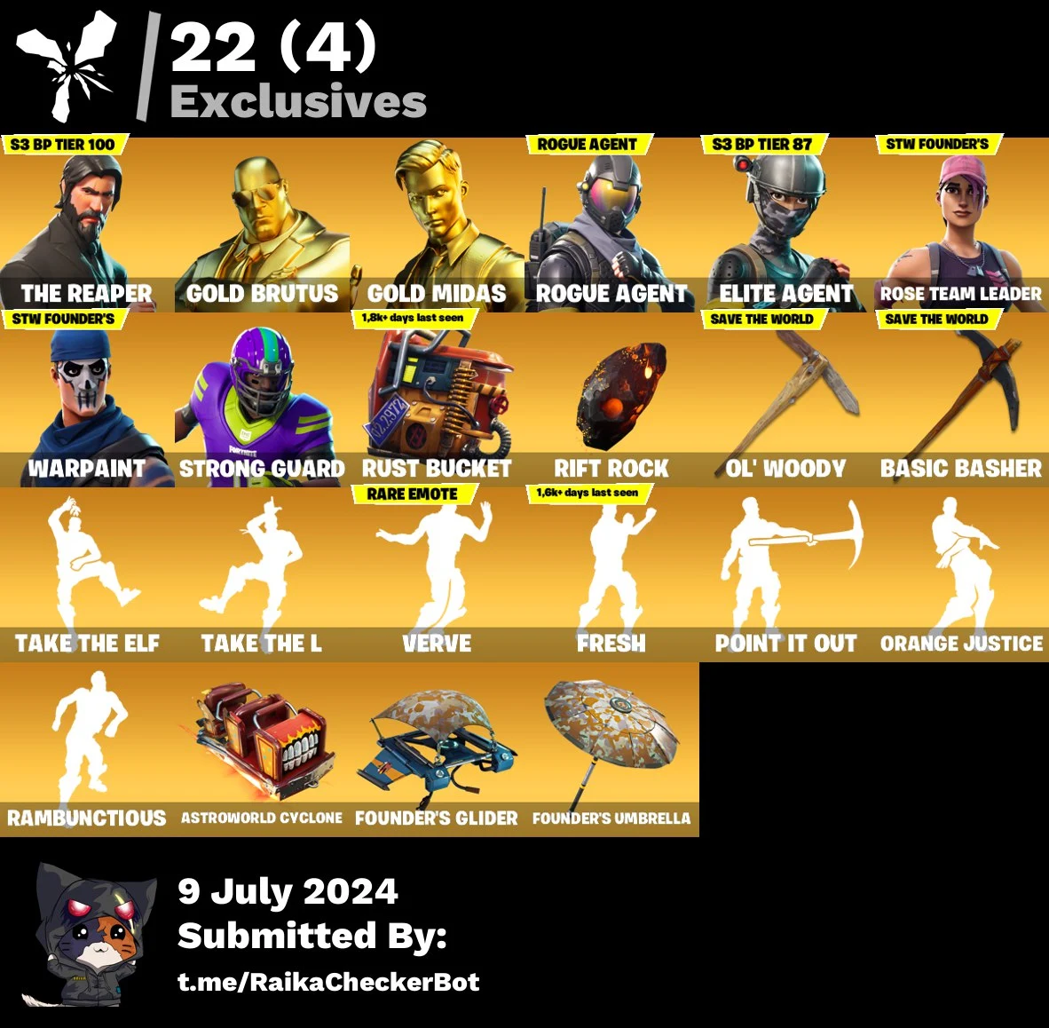 💥🌟💥 EXCLUSIVE OFFER 💥🌟💥 169 SKINS 💎 OG STW 💎 THE REAPER 💎 TAKE THE L 💎 ELITE AGENT 💎 GOLD BRUTUS 💎 GOLD MIDAS 💎 ROGUE AGENT 💎 STRONG GUARD 💎 BLACKHEART (STAGE 8) 💎 FULL ACCESS