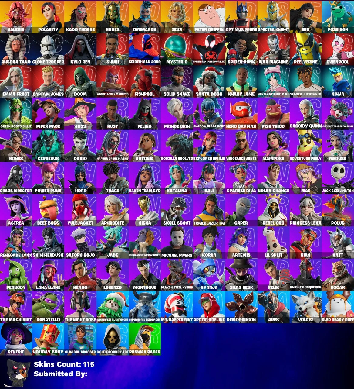 ๐ฅ๐ LIMITED OFFER ๐๐ฅ 115 SKINS ๐ VALERIA ๐ POLARITY ๐ KADO THORNE ๐ HADES ๐ OMEGAROK ๐ ZEUS ๐ PETER GRIFFIN ๐ OPTIMUS PRIME ๐ SPECTRA KNIGHT ๐ ERA ๐ POSEIDON ๐ AHSOKA TANO ๐ CLONE TROOPER ๐ KYLO REN ๐ SHURI ๐ SPIDER-MAN 2099 ๐ 250 VB ๐ FULL ACCESS ๐