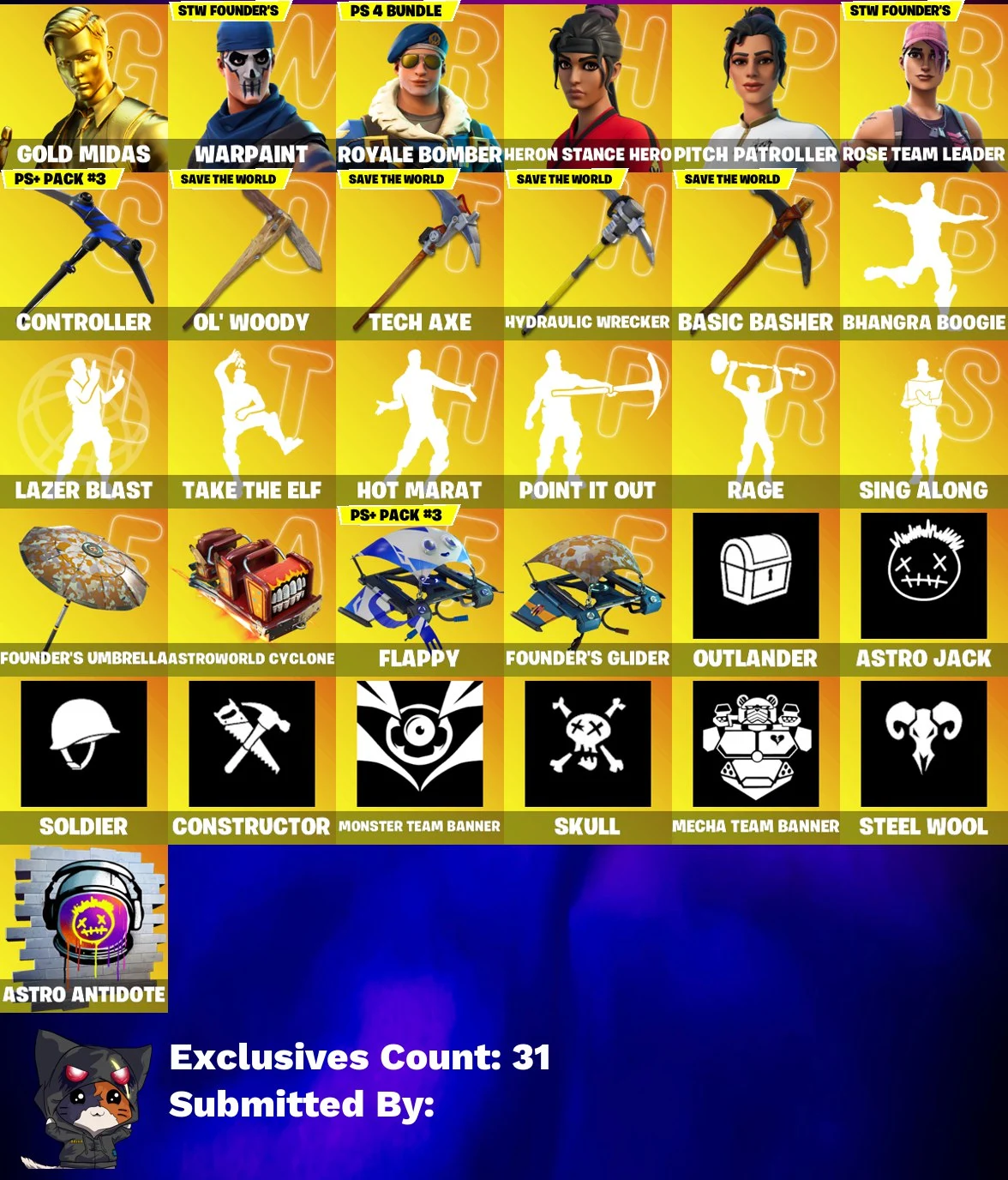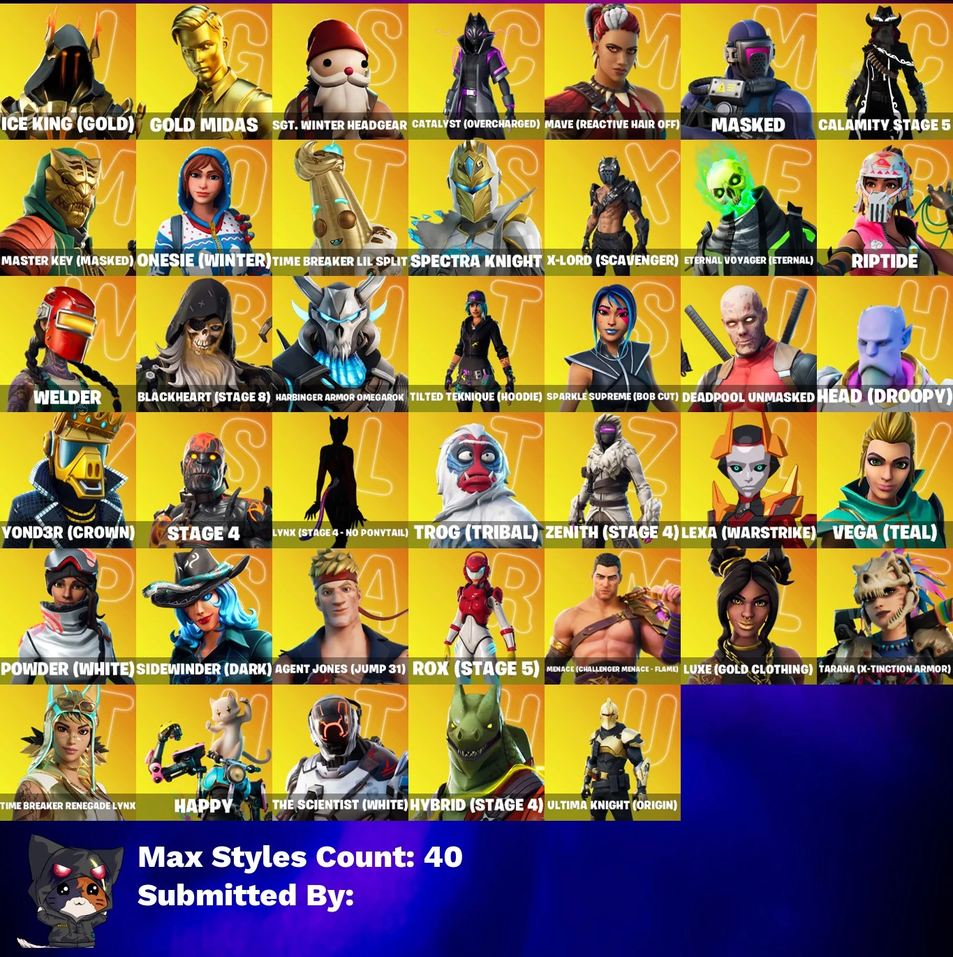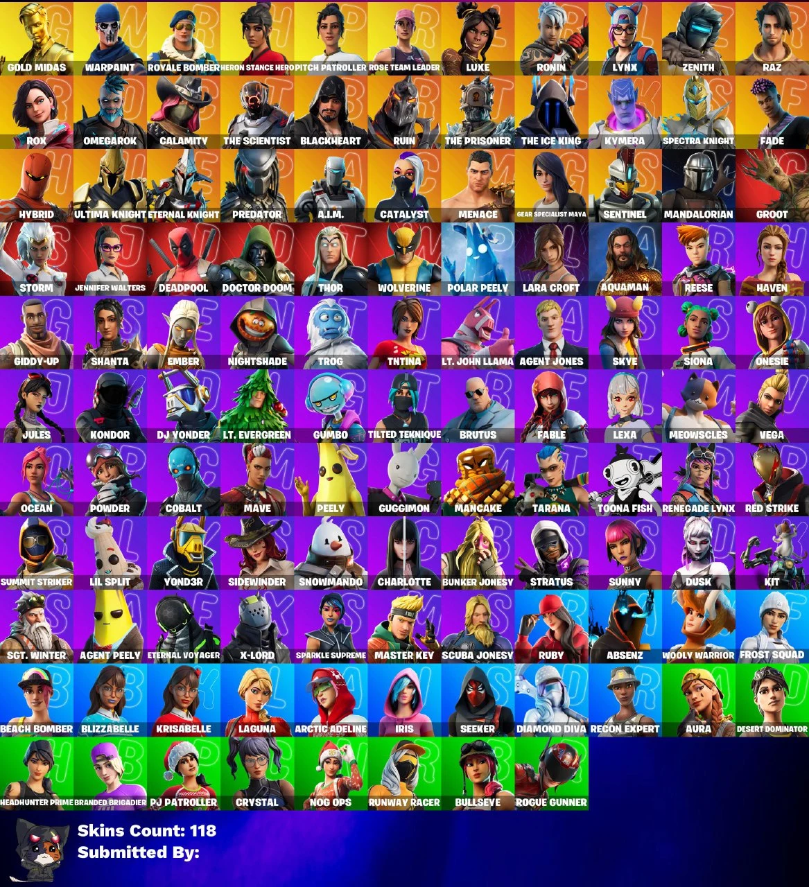 ๐ฅ๐ LIMITED OFFER ๐๐ฅ 118 SKINS ๐ GOLD MIDAS ๐ ROYALE BOMBER ๐ HERON STANCE HERO ๐ PITCH PATROLLER ๐ LUXE ๐ RONIN ๐ LYNX ๐ ZENITH ๐ RAZ ๐ ROX ๐ OMEGAROK ๐ CALAMITY ๐ THE SCIENTIST ๐ BLACKHEART ๐ RUIN ๐ THE PRISONER ๐ 470 VB ๐ OG STW ๐ FULL ACCESS ๐