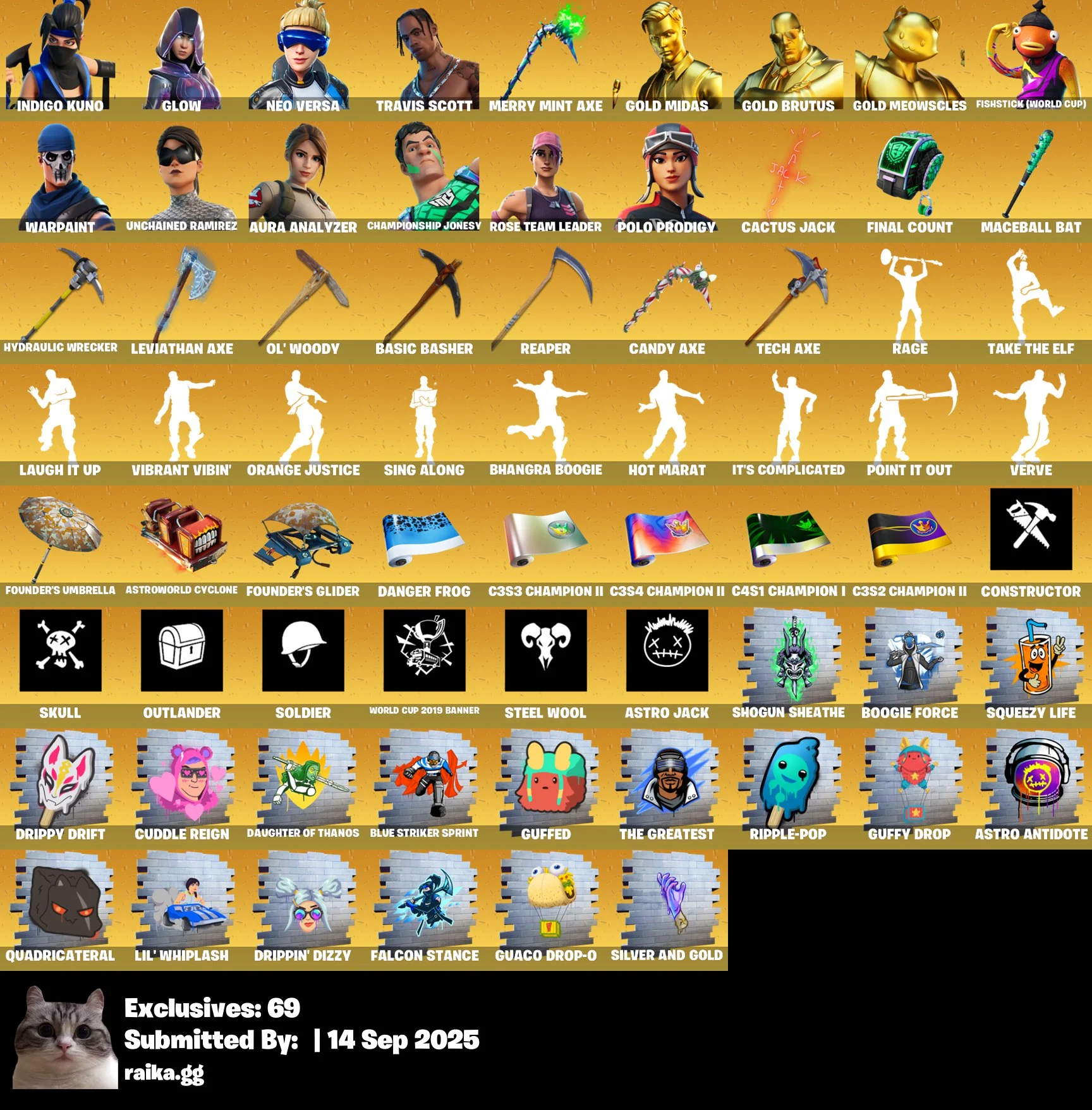 [PC] 285 skins | OG STW | Indigo Kuno | Glow | Neo Versa | Travis Scott | Gold Midas | Gold Brutus | Gold Meowscles | Fishstick (World Cup) | 65 VB