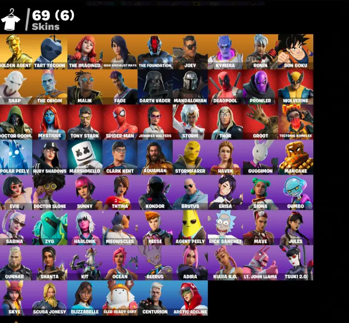 [PC] 69 skins | Gold Midas | Tart Tycoon | The Imagined | Gear Specialist Maya | The Foundation | Joey | Kymera | Ronin | Son Goku | Snap | 2200 VB