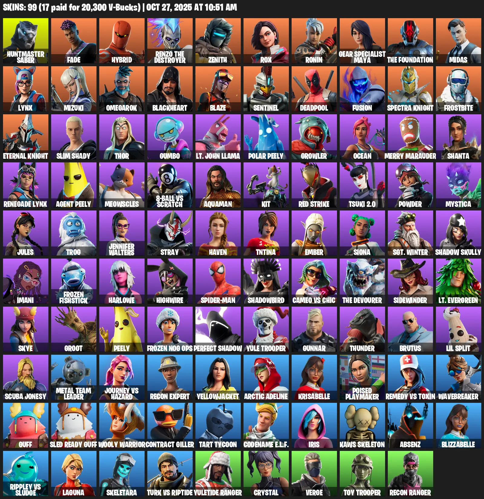 [PC] 99 Skins | Huntmaster Saber | Fade | Hybrid | Renzo the Destroyer | Zenith | Rox | Ronin | Gear Specialist Maya | The Foundation | Midas | Lynx | Mizuki | Omegarok | Blackheart | Blaze | Sentinel | Deadpool | Fusion | Spectra Knight | Frostbite