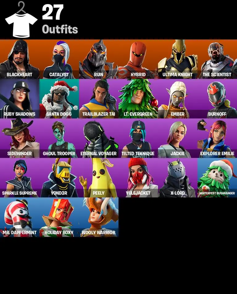 【PC/NS/PSN】  26 skins 🔥 Ronin 🔥 Mizuki 🔥 Renzo the Destroyer 🔥 Spider-Man 🔥 Polar Peely 🔥 Ruby Shadows 🔥 Stray 🔥 Haven 🔥 Highwire 🔥 Imani 🔥 Lt. Evergreen 🔥 100 VB