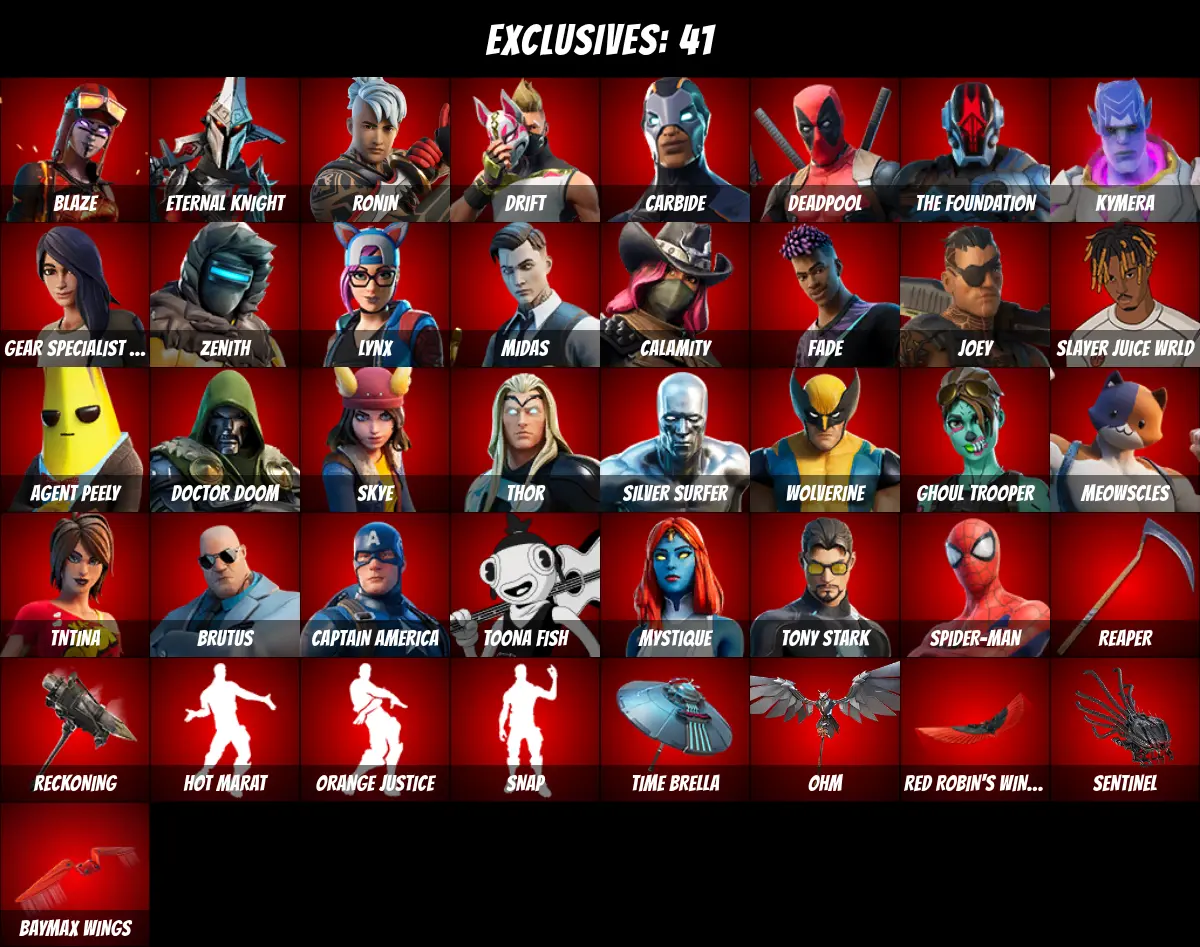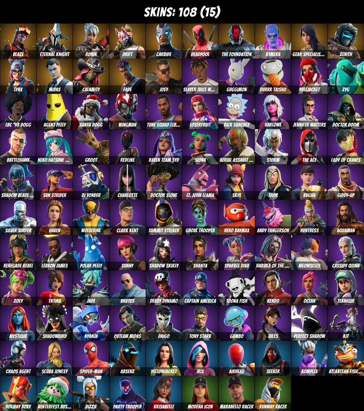 ⚡PC/PSN/XBOX⚡ 108 skins 💎 Ghoul Trooper 💎 Rick Sanchez 💎 Drift 💎 Deadpool 💎 Tony Stark 💎 Midas 💎 Lynx 💎 Jules 💎 Blaze 💎 Agent Peely 💎 Calamity 💎 Modena Icon 💎 Spider-Man 💎 Toona Fish 💎 Meowscles 💎 Thor 💎 Captain America 💎 Eternal Knight 💎 300 V-Bucks 💎