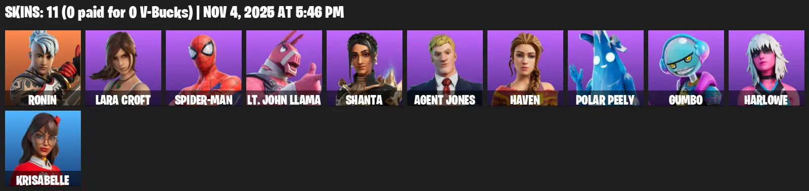 [PC/PSN/XBOX] | 11 skins | Lara Croft | Ronin | Spider-Man | Lt. John Llama | Shanta | Agent Jones | Haven | Polar Peely | Gumbo | Harlowe | S4G