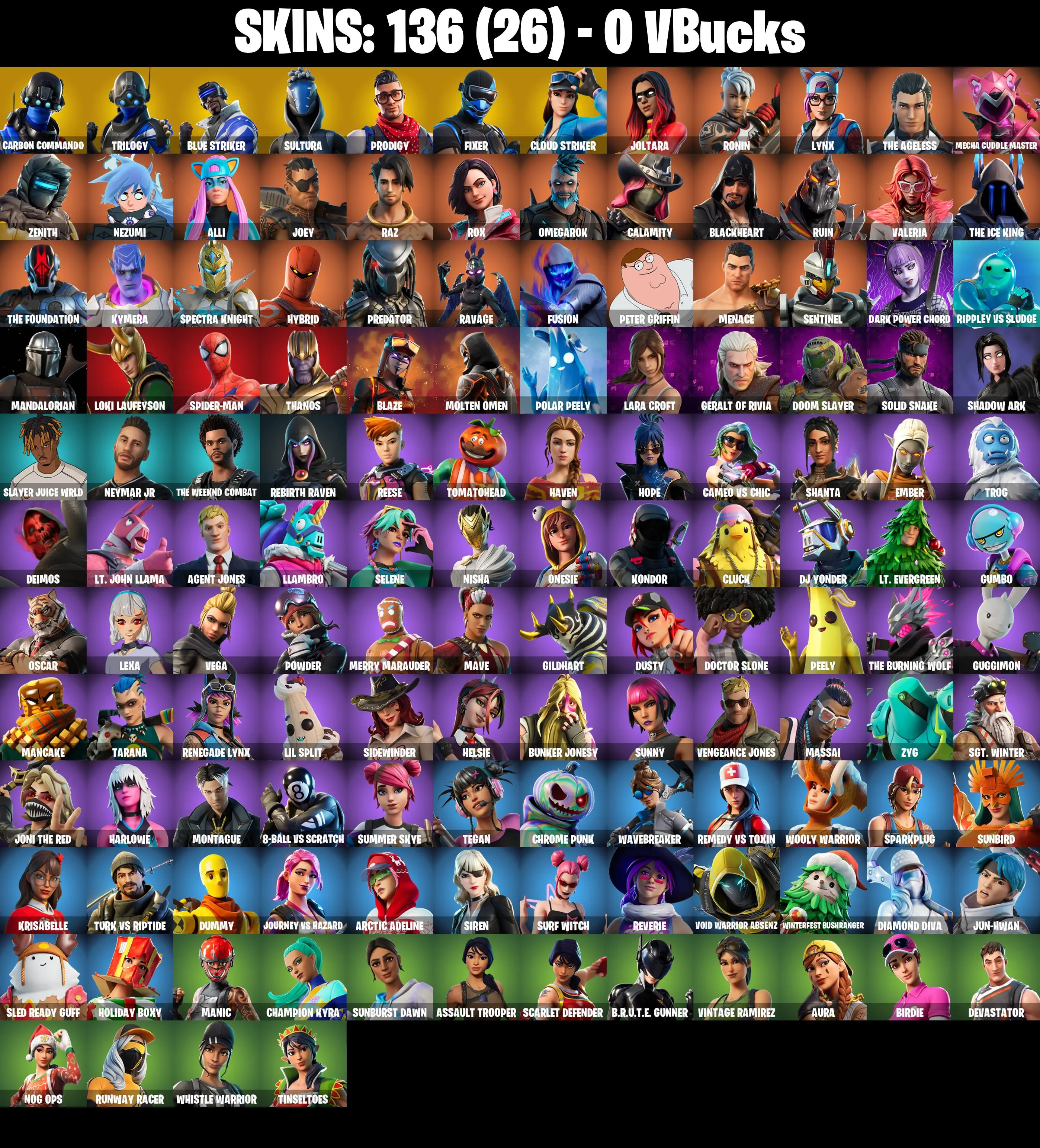 PC/PSN/XBOX ♨️136 skins ✨ Lara Croft ✨ Orange Justice ✨ The Ice King ✨ Alli ✨ Peely ✨ Fusion ✨ Spider-Man ✨ Menace ✨ The Ageless ✨ Lynx ✨ #B738