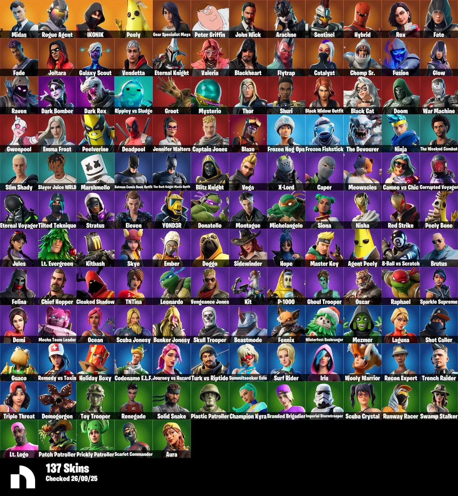 [PC/PSN/XBOX] 137 Skins + Ikonik + Galaxy Scout + Joltara + Dark Bomber + Glow + Fate + John Wick + Batman Comic + Blaze + DeadPool + Frozen Nog Ops + Meowscles -Parent Control