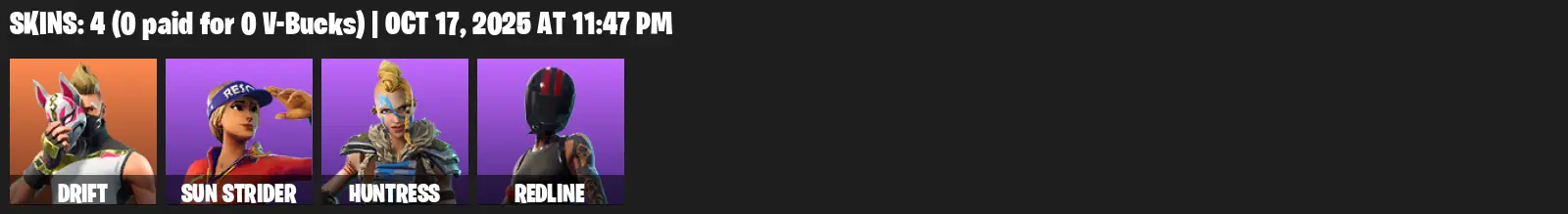[PC/PSN/XBOX] | 4 skins | 900 V-bucks | Drift | Sun Strider | Huntress | Redline | Rift Edge | Balloon Axe | Lug Axe | Default Pickaxe | S4G