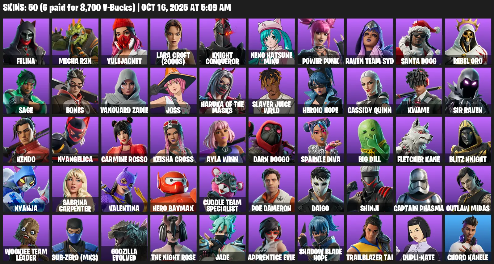 🍨 [PC/PSN/XBOX] 🌟 50 skins | Felina , Mecha R3X , Yulejacket , Lara Croft (2000s) , Knight Conqueror , Neko Hatsune Miku , Power Punk , Raven Team Syd , Santa Doog | 💙 750 VBUCKS | ✉️ Changeable Email Now
