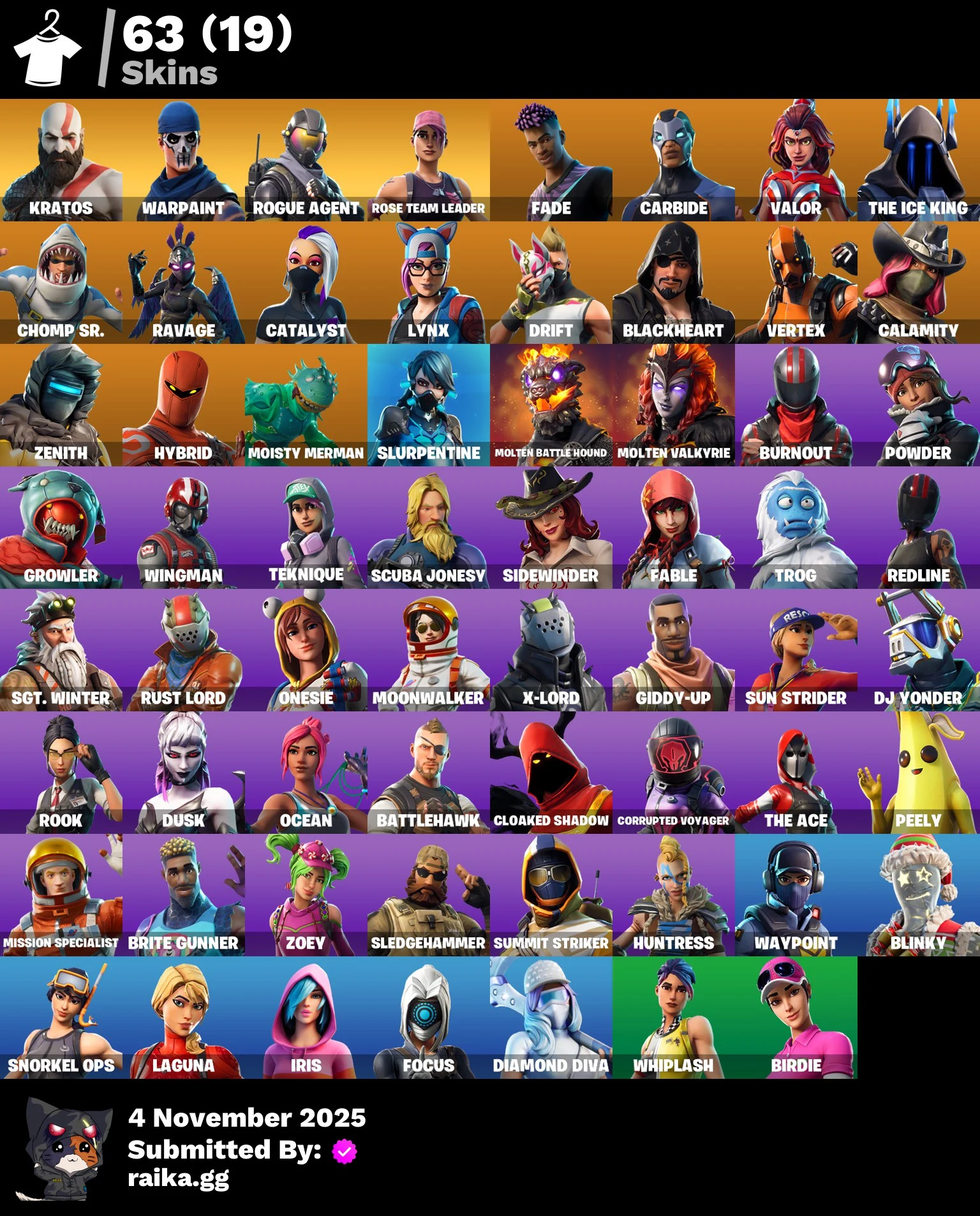 [PC/PSN/XBOX] 63 skins | LEVIATHAN AXE | OG STW | Kratos | Rogue Agent | Fade | Carbide | Valor | The Ice King | Chomp Sr. | Ravage | Catalyst | Lynx | Drift | Blackheart | 1300 VB
