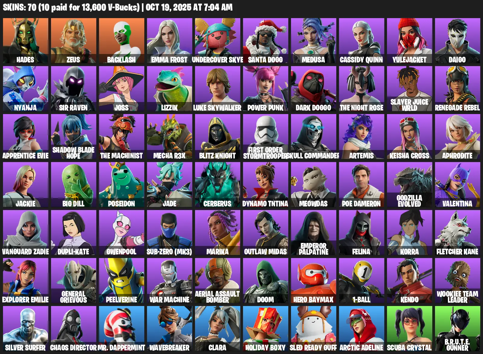 🍨 [PC/PSN/XBOX] 🌟 70 skins | Hades , Zeus , Emma Frost , Luke Skywalker , Blitz Knight , Cerberus , Doom , Hero Baymax , Emperor Palpatine | 💙 50 VBUCKS | ✉️ Changeable Email Now