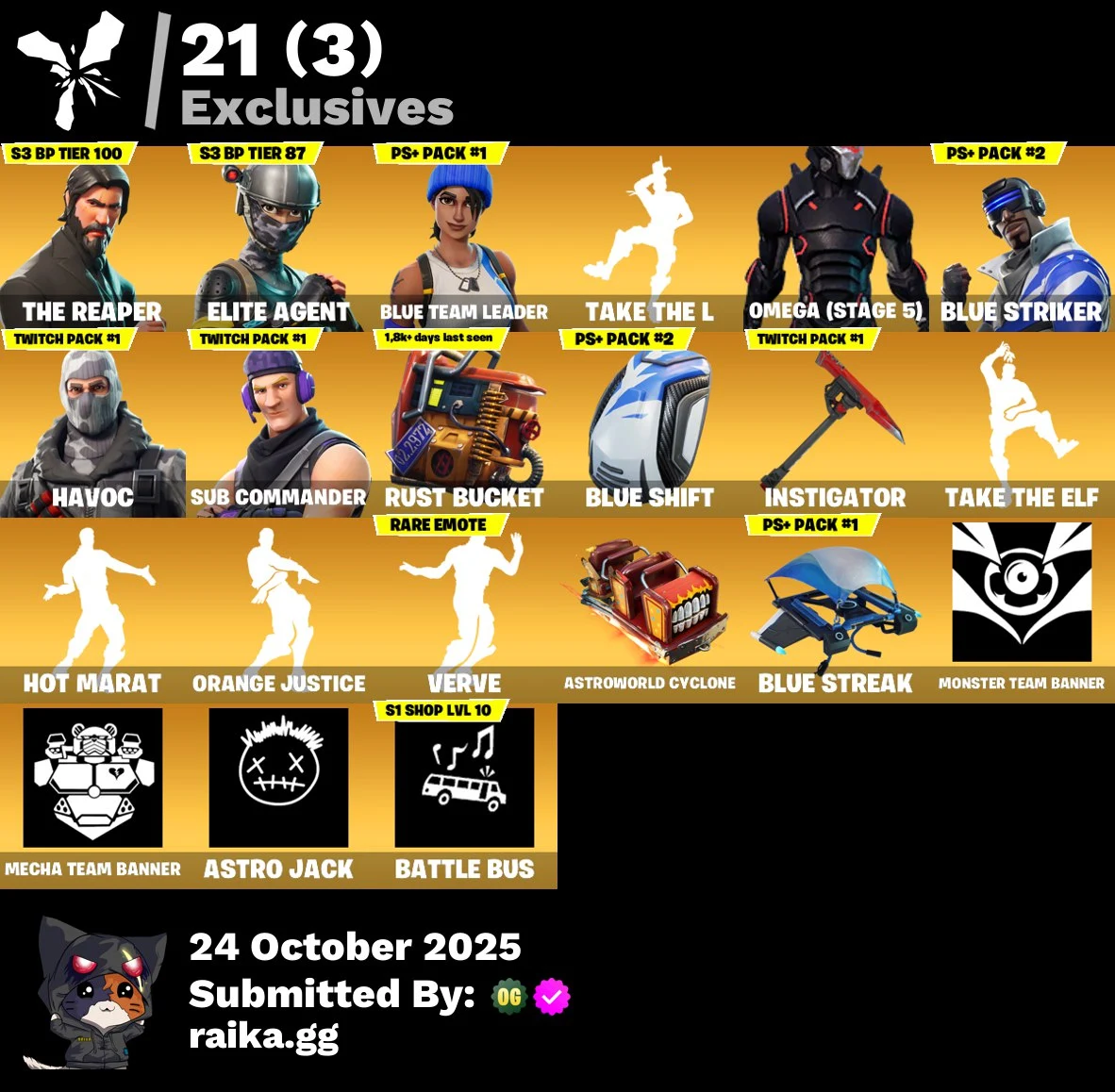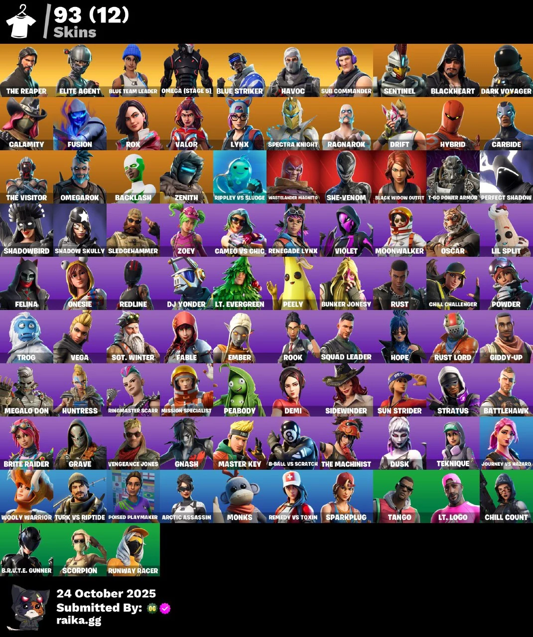 PC/PSN/Xbox/Nintendo 93 skins | The Reaper | Elite Agent | Blue Team Leader | Omega (stage 5) | Blue Striker | Havoc | Sub Commander | Sentinel | Blackheart | 50 VB