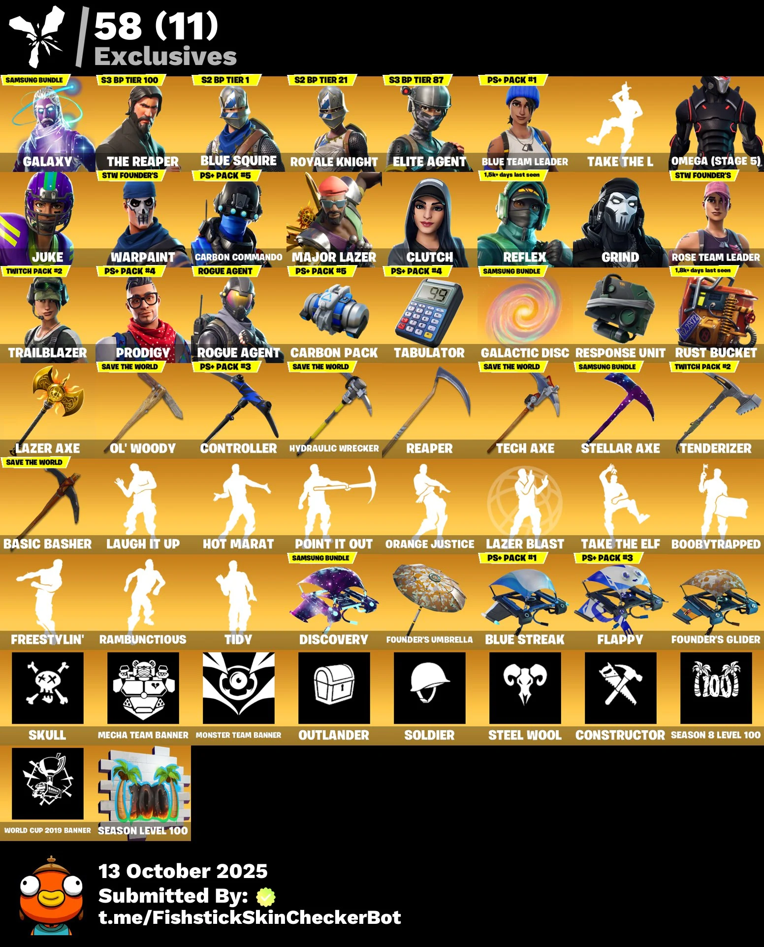 [PC/PSN/XNOX] 176 skins | OG STW | Galaxy | The Reaper | Blue Squire | Royale Knight | Elite Agent | Blue Team Leader | Omega (stage 5) | Reflex | Juke | Carbon Commando | 100 VB