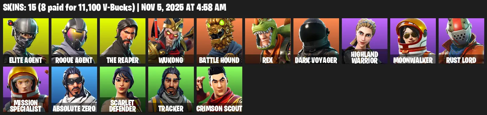 [PC/XBOX] | 15 skins | Take The L | The Reaper | Elite Agent | Rogue Agent | Wukong | Battle Hound | Rex | Dark Voyager | Highland Warrior | S4G