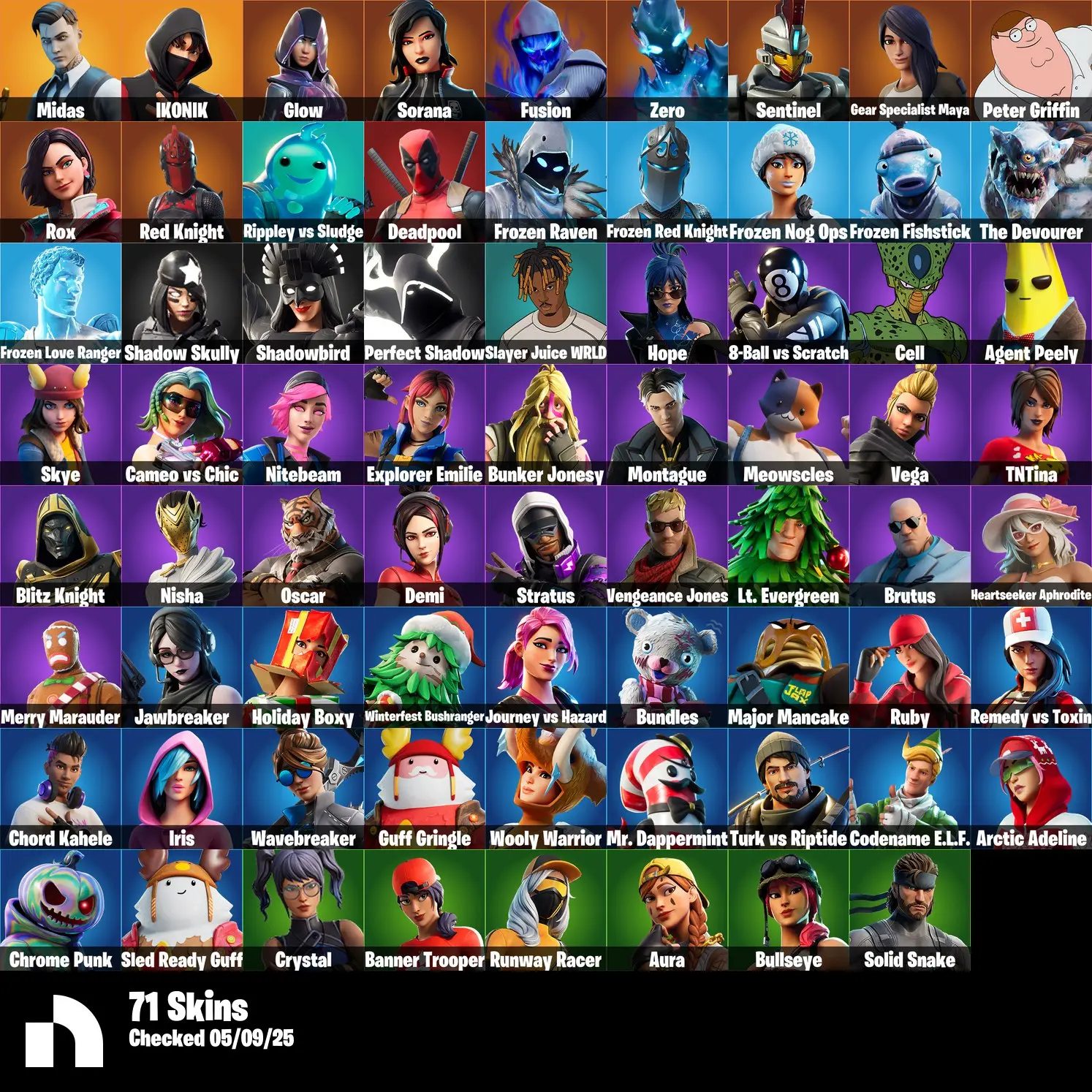 [PC/XBOX] 71 Skins | IKONIK | Midas | Welcome! | Shadow Skully | Frozen Skins | Glow | Meowscles| Glow | 1350 VB