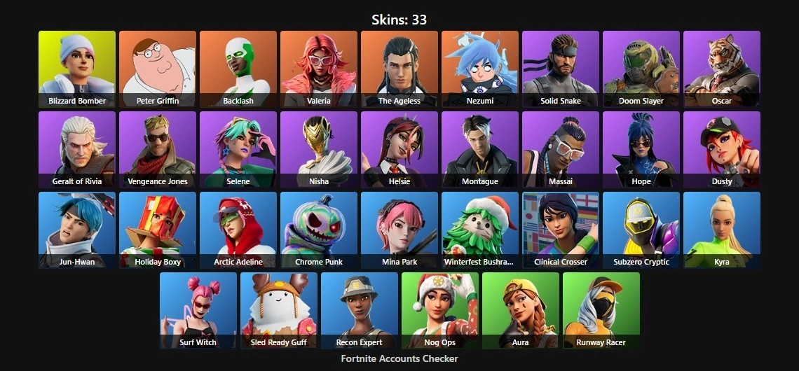 PC/XBOX/PSN 33 Skins⚡ | Blizzard Bomber | Peter Griffin | Backlash | Valeria | The Ageless | Nezumi | Solid Snake | Doom Slayer | Oscar | Geralt of Rivia
