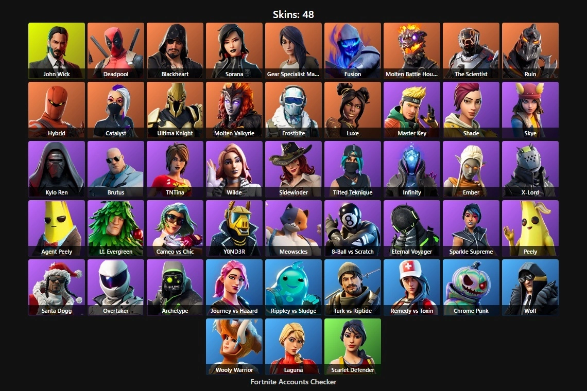 PC/XBOX/PSN 48 Skins⚡ | Deadpool | Peely | John Wick | Blackheart | Sorana | Gear Specialist Maya | Fusion | Molten Battle Hound | The Scientist | Ruin