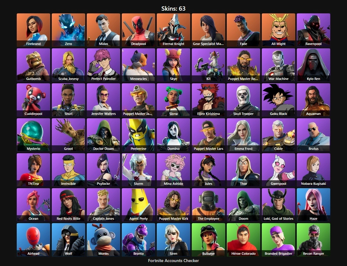 PC/XBOX/PSN 63 Skins⚡ | Midas | Deadpool | Skull Trooper | Firebrand | Zero | Eternal Knight | Gear Specialist Maya | Fade | All Might | Ravenpool | Gutbomb
