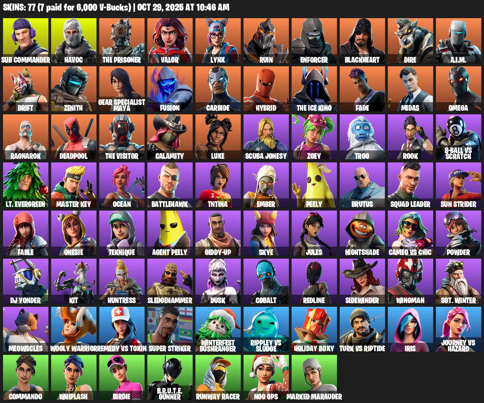 [PSN/XBOX/PC] 77 Skins | Sub Commander | Havoc | The Prisoner | Valor | Lynx | Ruin | Enforcer | Blackheart | Dire | A.I.M. | Drift | Zenith | Gear Specialist Maya | Fusion | Carbide | Hybrid | The Ice King | Fade | Midas | Omega | Ragnarok | Deadpool