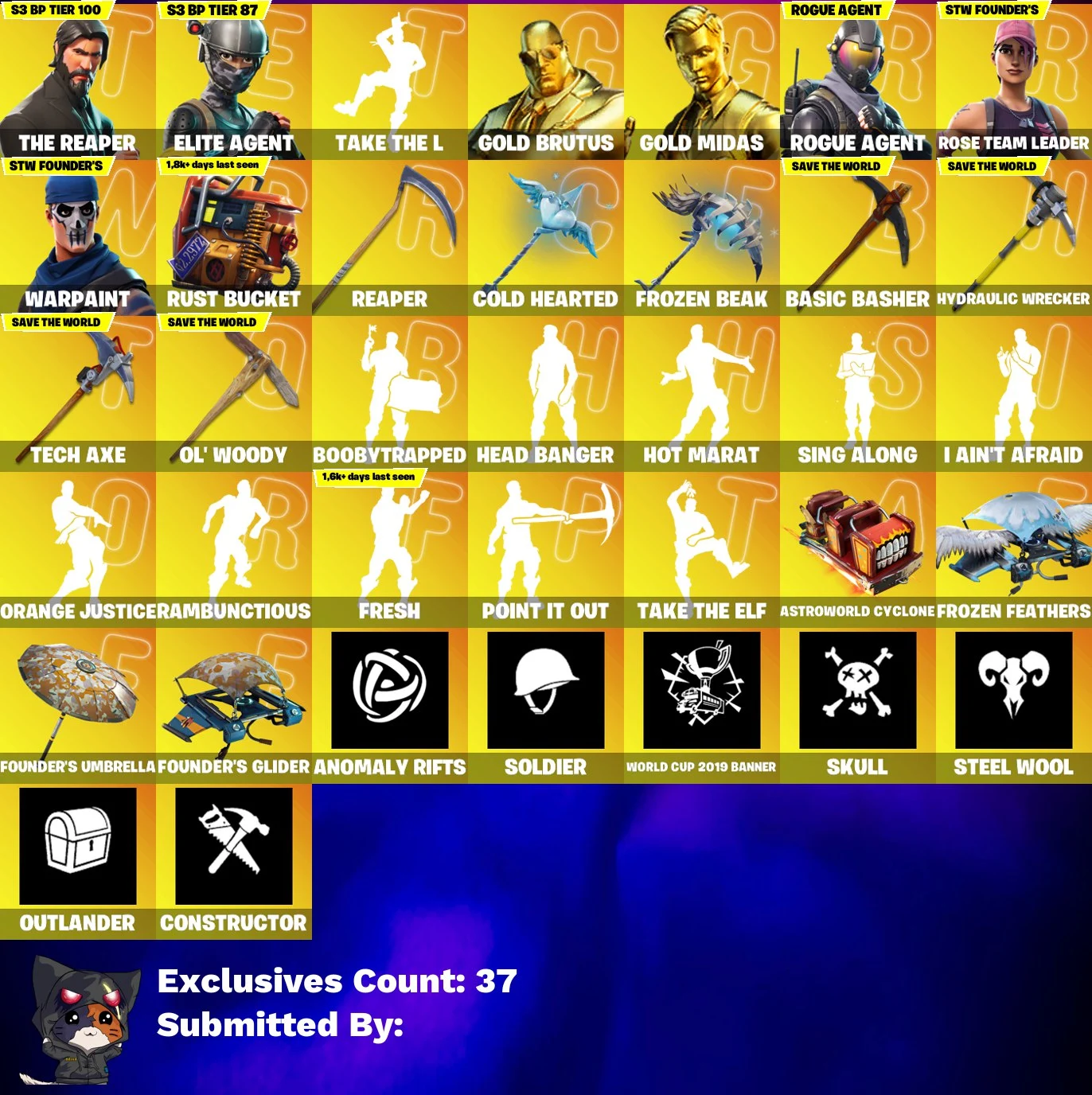 🎒🔥 STACKED OG ACCOUNT 🔥🎒 177 SKINS 💎 THE REAPER 💎 TAKE THE L 💎 GOLD BRUTUS 💎 GOLD MIDAS 💎 ROGUE AGENT 💎 THE CUBE QUEEN 💎 RAVEN 💎 SENTINEL 💎 RAVAGE 💎 OMEGA 💎 MOISTY MERMAN 💎 THE VISITOR 💎 OG STW 💎 FULL ACCESS 💎
