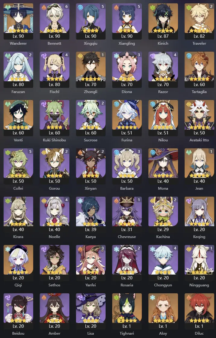 NA | AR 55 | 14 + 1 Leg | Zhongli C1 | Kinich | Wanderer | Venti | Nilou | Furina | Itto | Tighnari | Diluc | Mona | Qiqi | Keqing | Jean C1 | Tartaglia