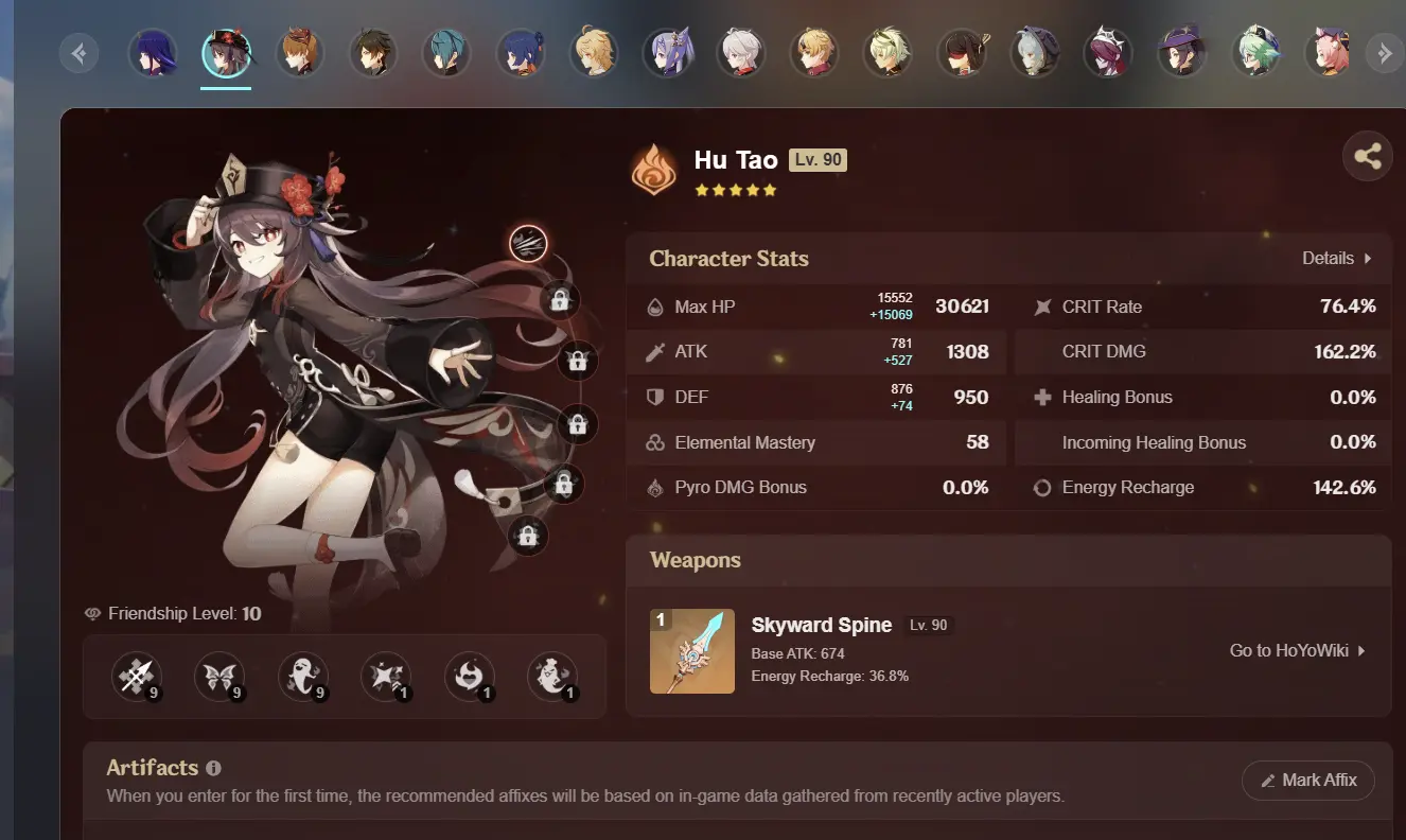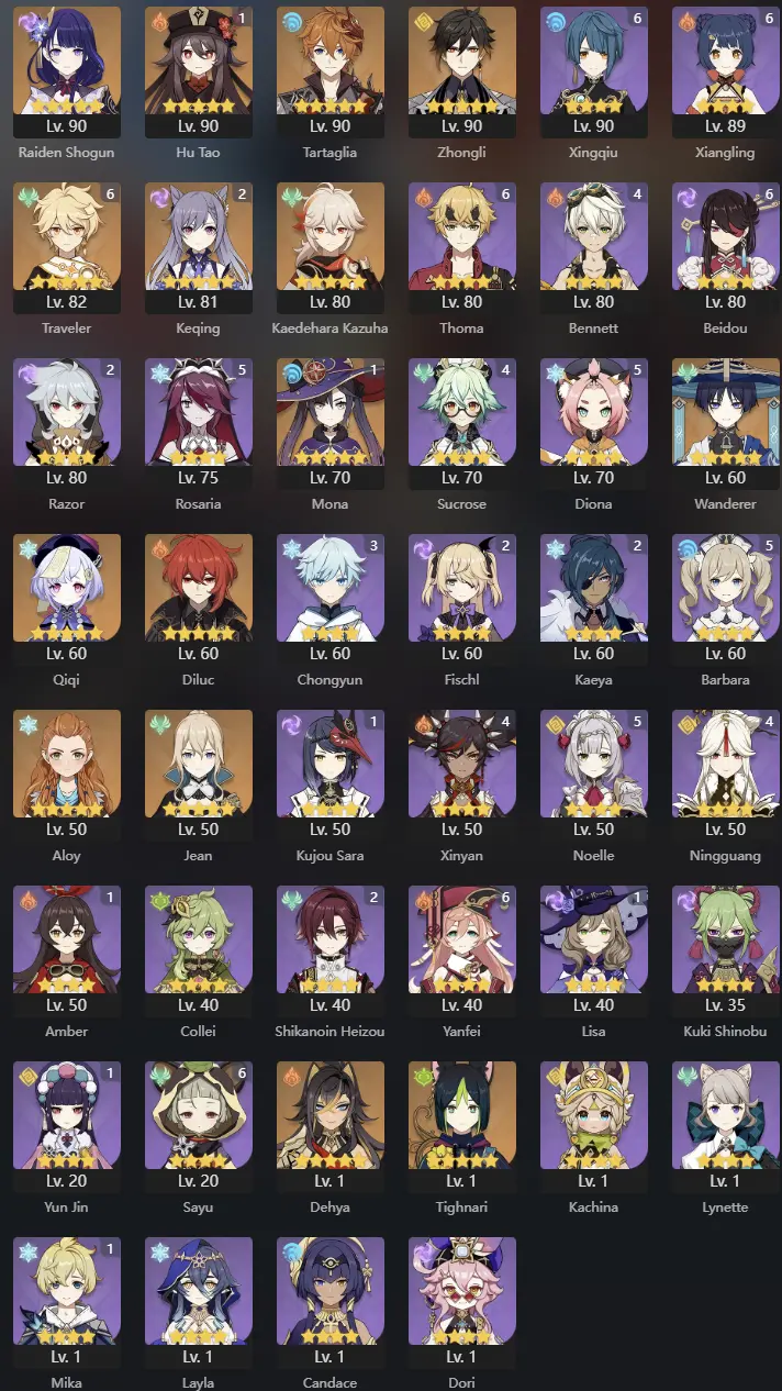 NA | AR 57 | 13 + 3 Leg | Hu Tao C1 | Zhongli | Raiden | Tighnari | Dehya | Kazuha | Qiqi | Diluc | Tartaglia | Mona C1 | Keqing C2