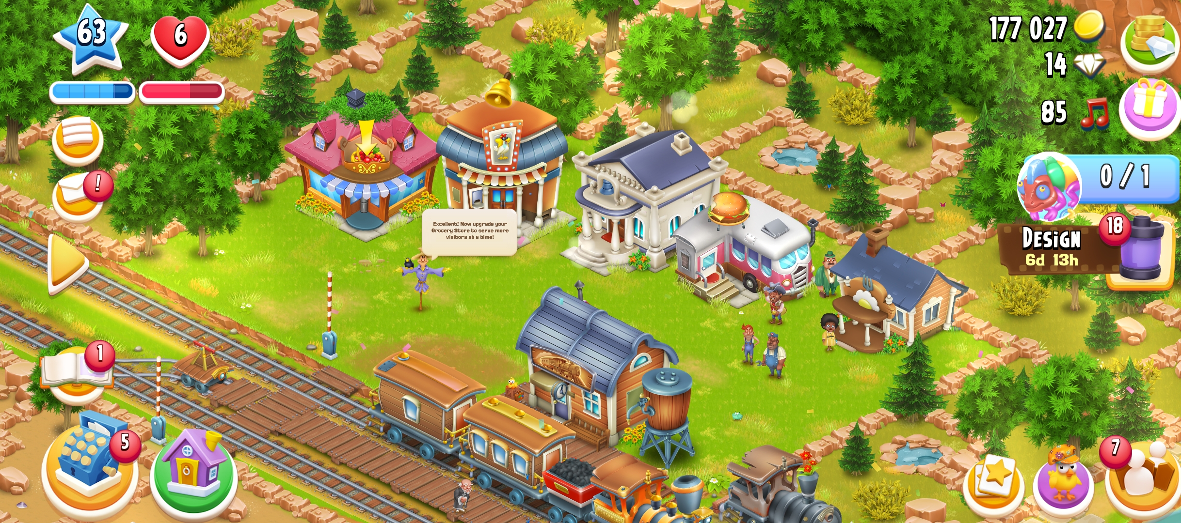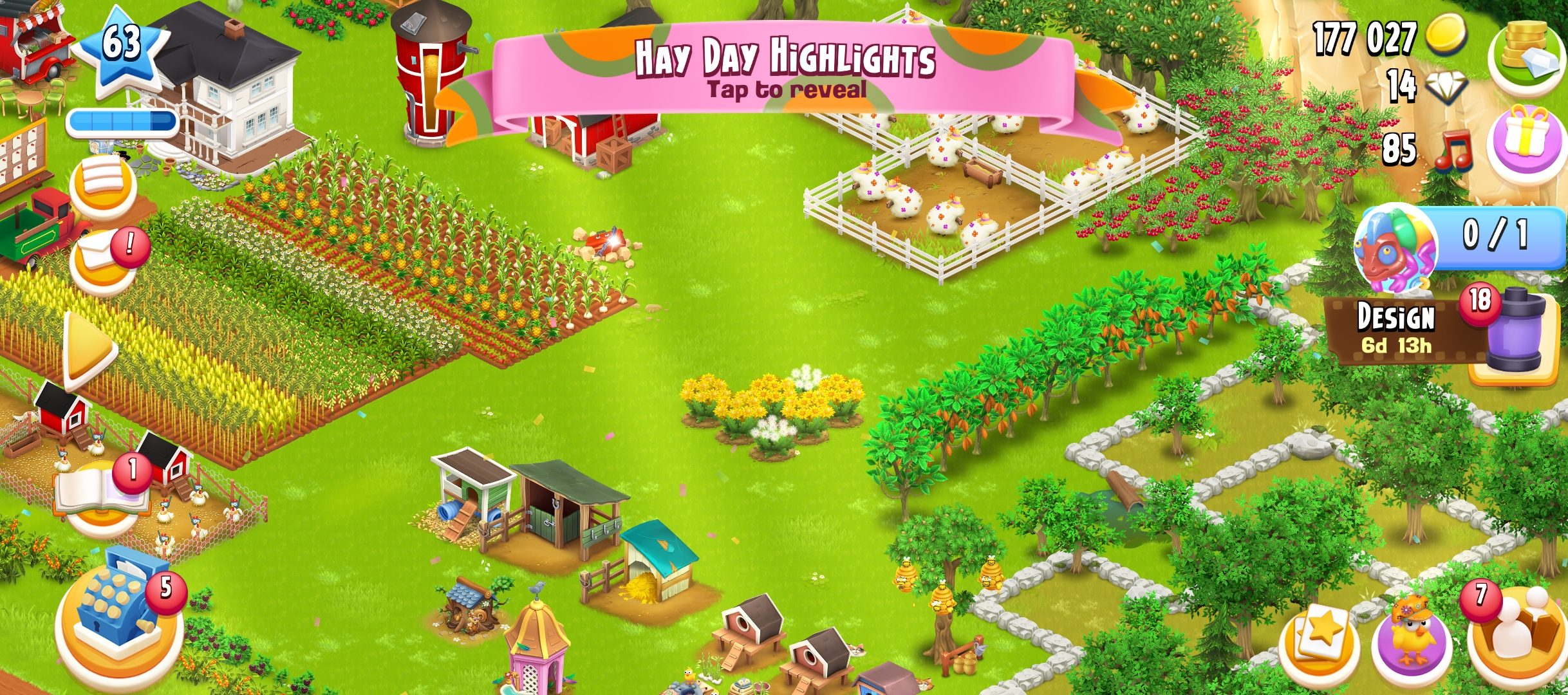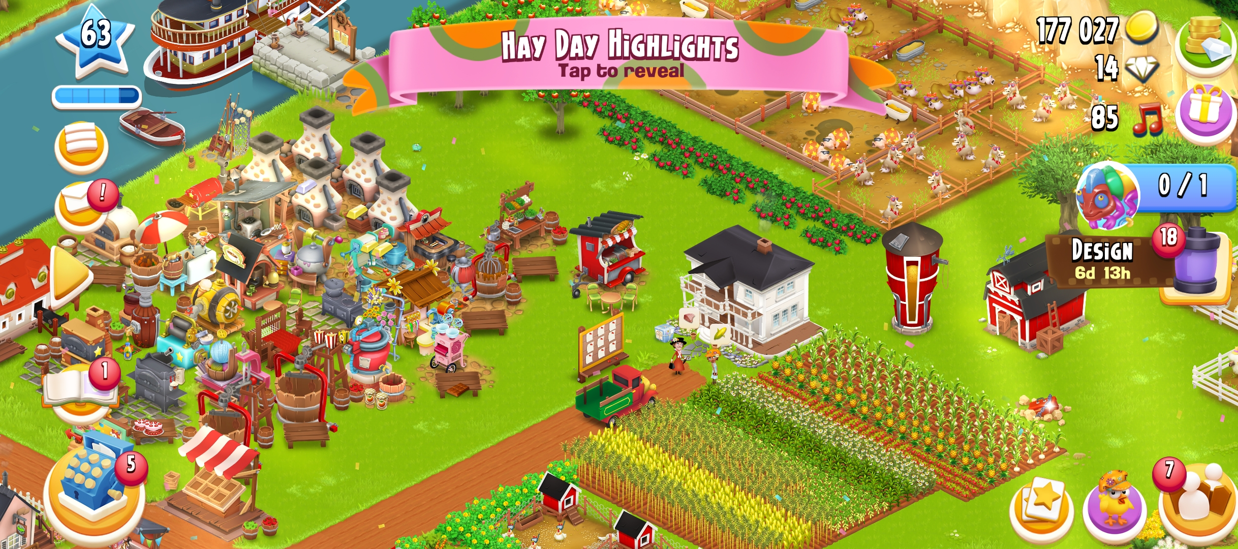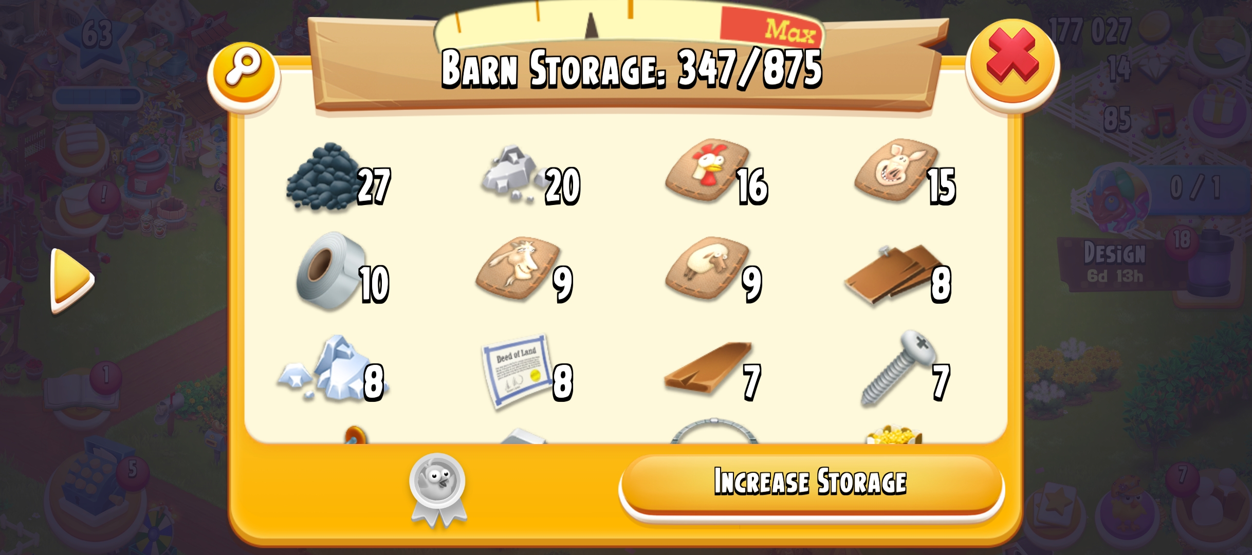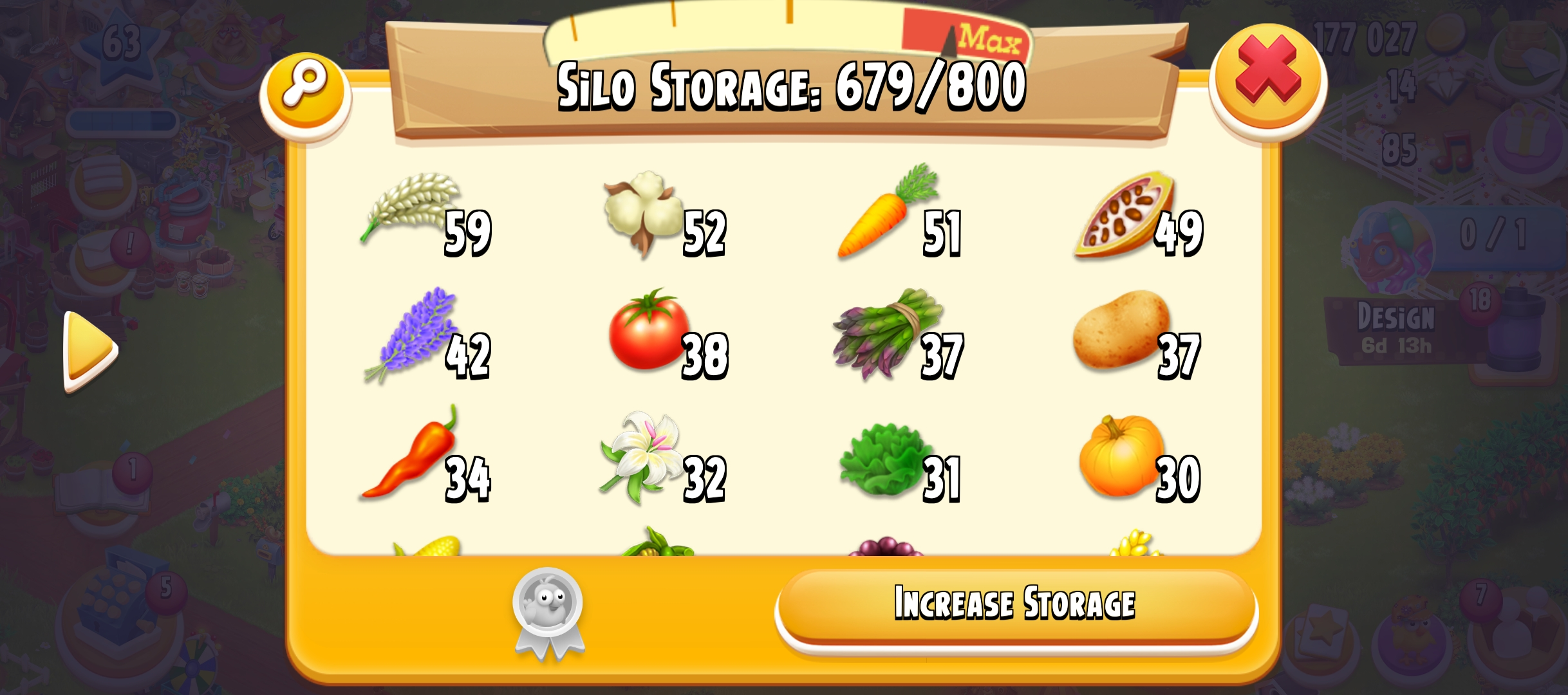 63 level | 875 Barn Storage | 800 Silo Storage | 177k coin | 14 gems | Android & IOS