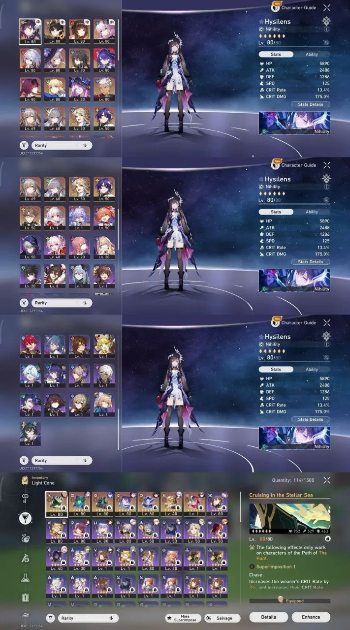 All Platform 🎮 EU 🇪🇺 Level68 💎 41 Characters 19 5'Star 🌟 7 Weapon 5 Star 🥶 The Herta 🧨 Evernight 🌐 Acheron 🧩 Hysilen ☠️ Jade 🎮 Code900