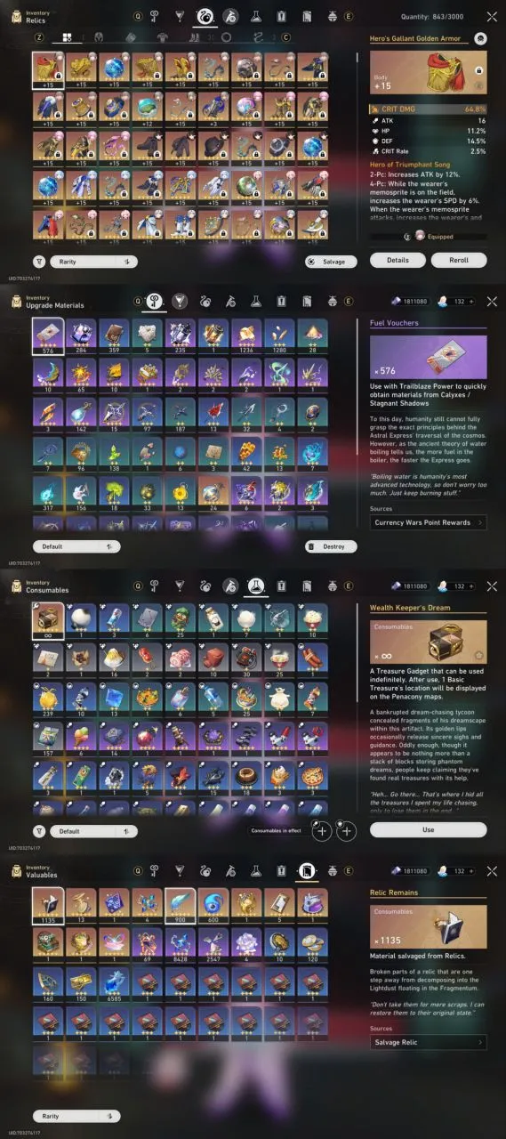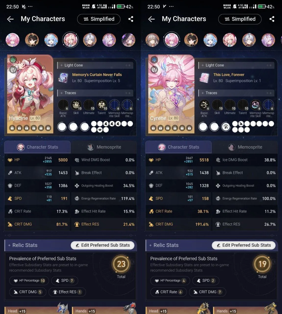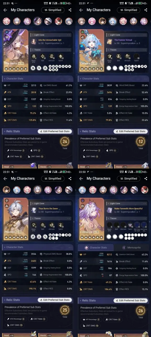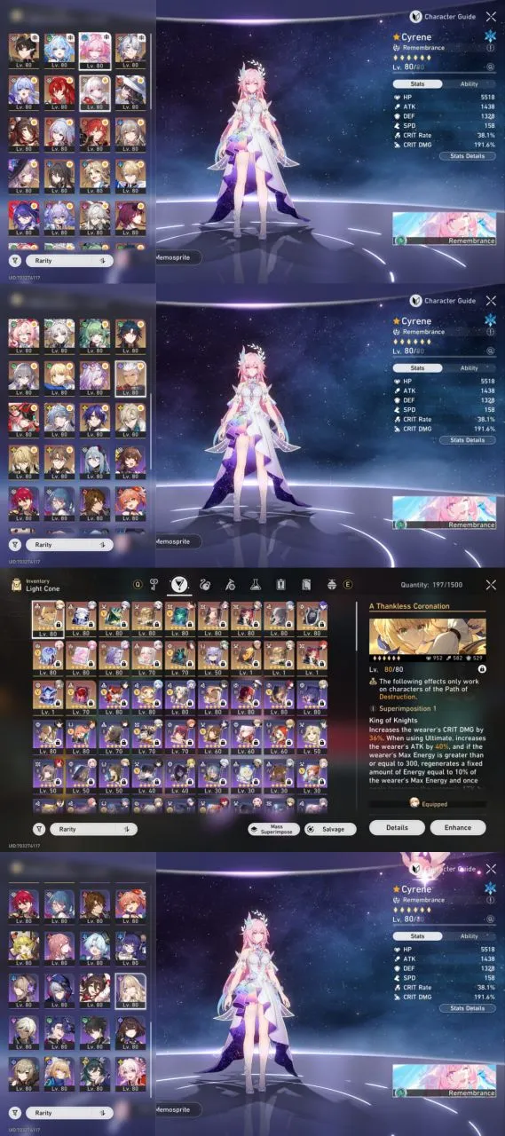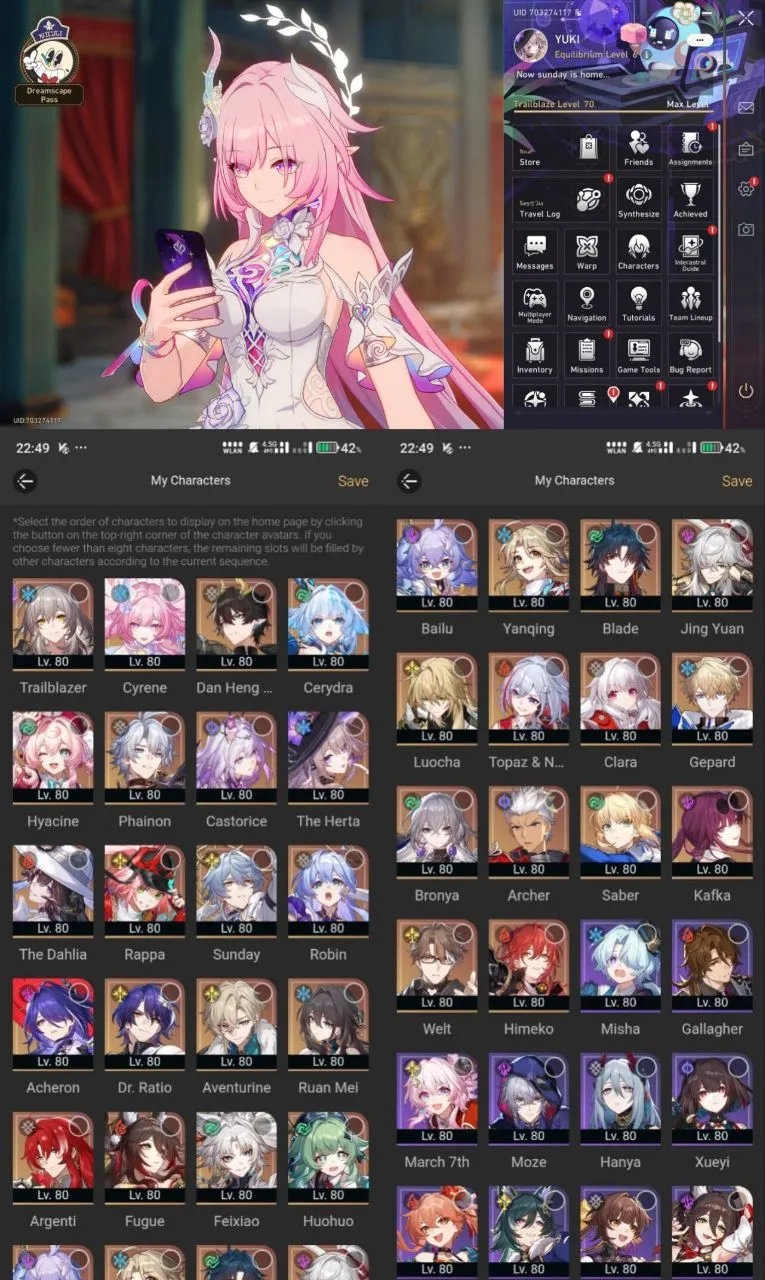 All Platform 🎮 EU 🇪🇺 Level70 🛍️ 56 Character 34 5'Star 🌟 20 Weapon 5'Star 🏆 The Herta 💎 Hyacine 🛡️ Cyrene 🌹 Cerydra 🛍️ Phainon 🎉 Code1264