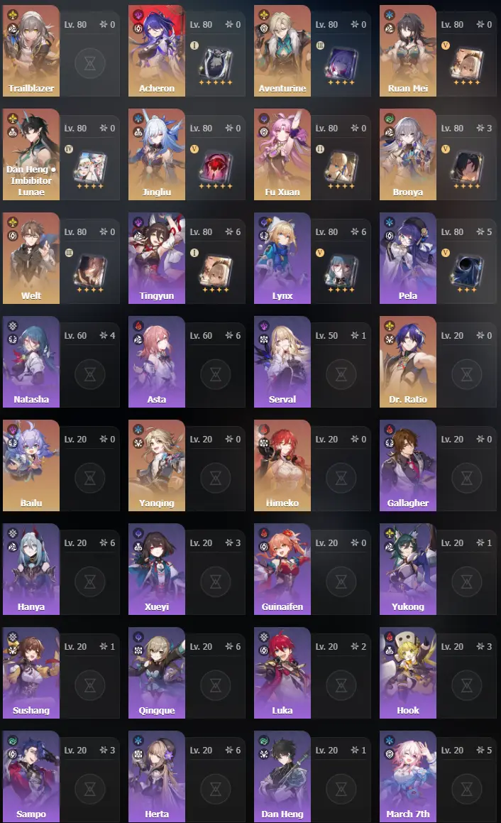 NA | TL 69 | 12 + 2 Leg | Bronya C3 | Aventurine | Ruan Mei | Dan Heng • Imbibitor Lunae | Jingliu | Fu Xuan | Welt | Acheron | Bailu | Dr. Ratio | Himeko | Yanqing