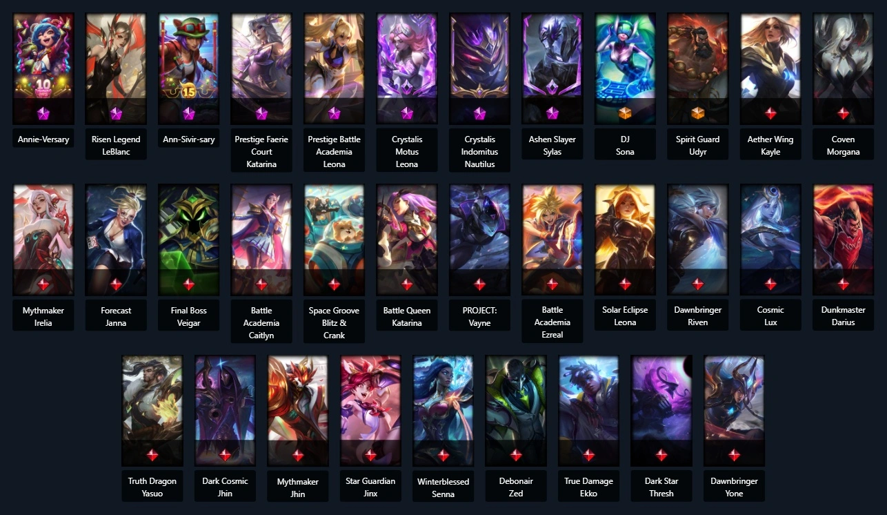 UnRanked┃230 skins┃171 Champs┃(8 Mythic) Crystalis Motus Leona Ashen Slayer Sylas Crystalis Indomitus Nautilus Prestige Battle Academia Leona Prestige Faerie Court Katarina Dark Star Thresh Battle Queen Katarina