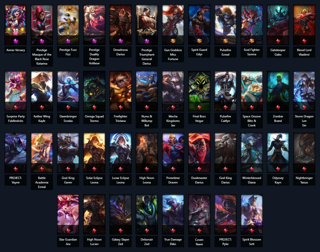 UnRanked┃311 skins┃171 Champs┃(6 Mythic) Prestige Duality Dragon Volibear Prestige Fuzz Fizz Dreadnova Darius Prestige Triumphant General Darius Dawnbringer Soraka God-King Darius Mecha Kingdoms Jax